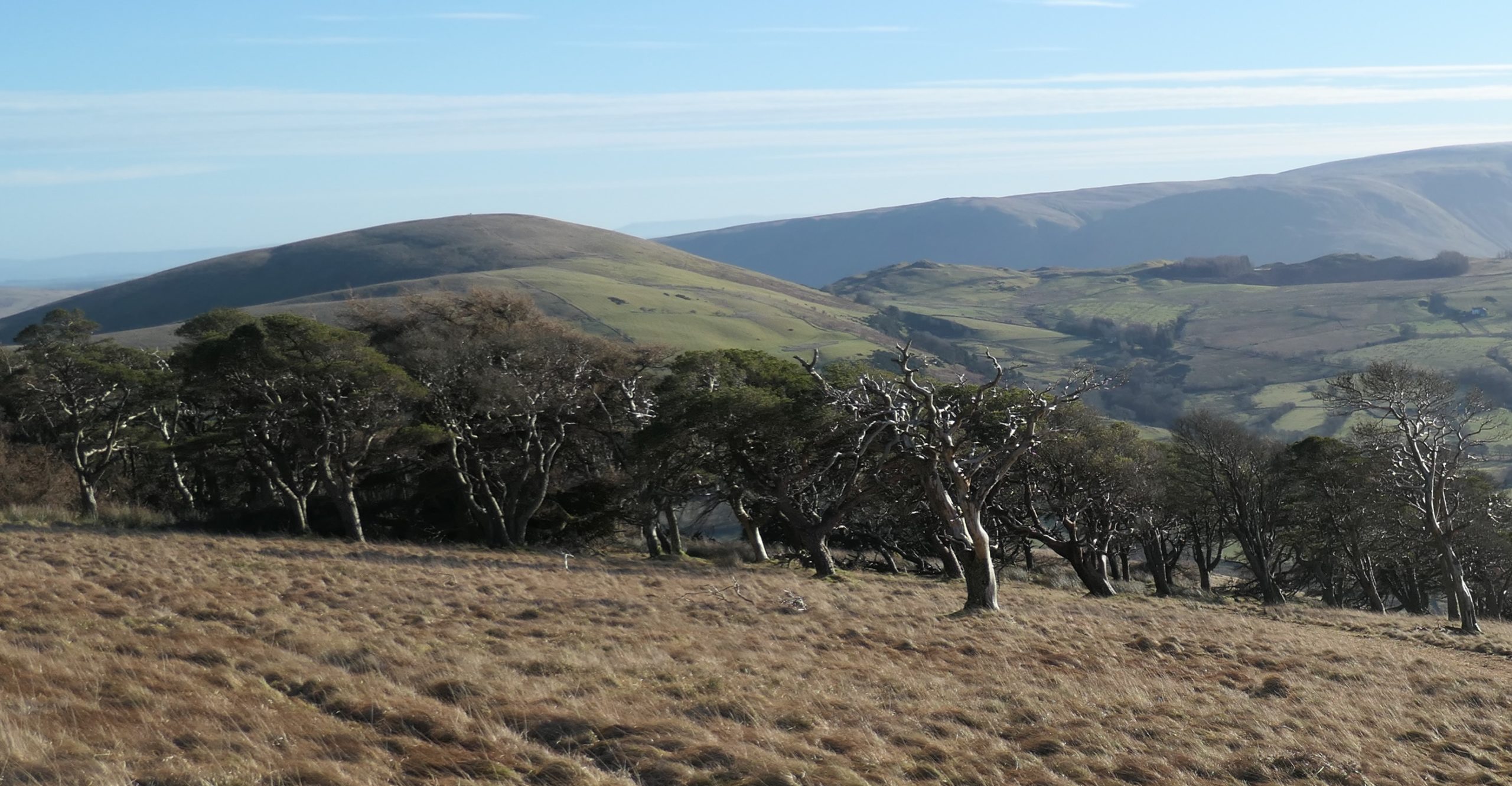 The path to Brownrigg Farm (beware the bog)After a very short walk up the road a track, leading off to the left is met. The track is followed until you reach a gate (you can climb the stile if you like) which then takes you out onto the open fell. The walk up Great Mell Fell is a far more interesting one than its little brother across the valley. There is small wood at the start which the path skirts around on a rocky path and then after an open grassland section another little copse of windswept almost petrified trees, Scots Pines apparently are reached. Wainwright makes mention of these: “bleached skeletons of trees near the top of the fell”.