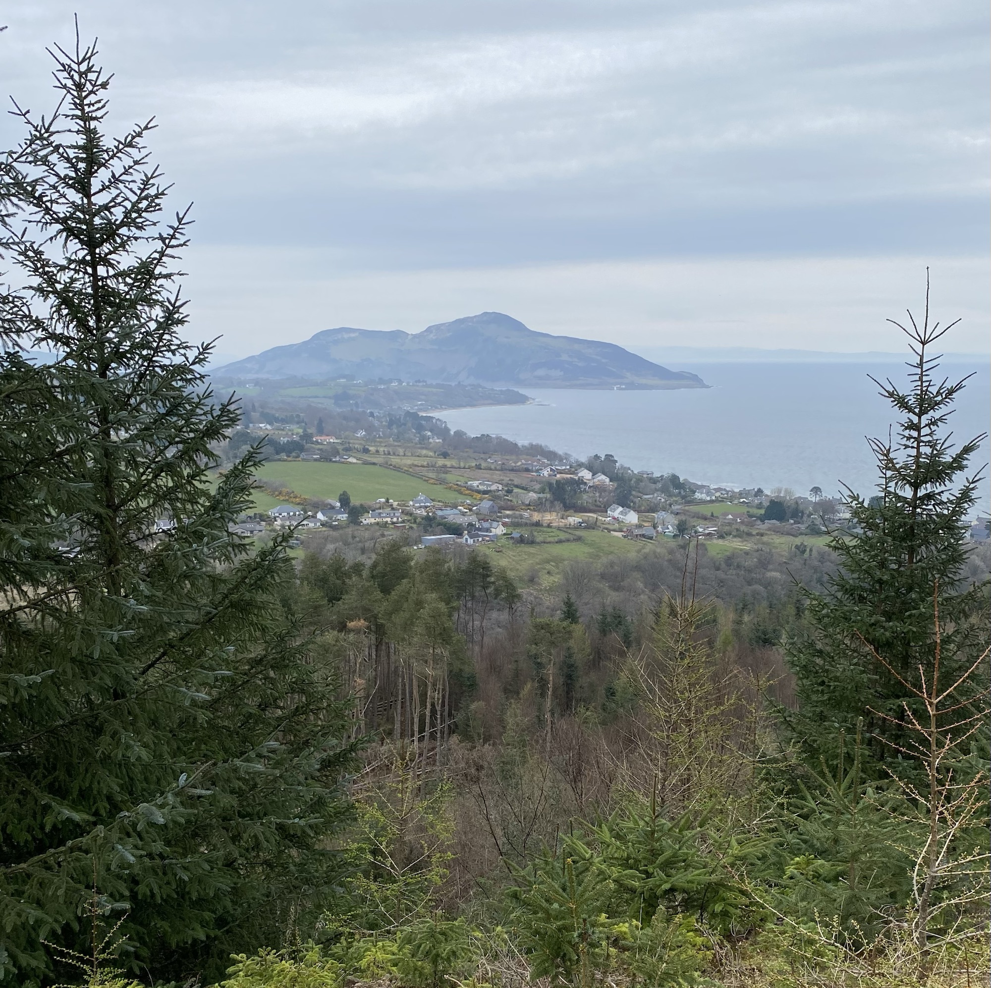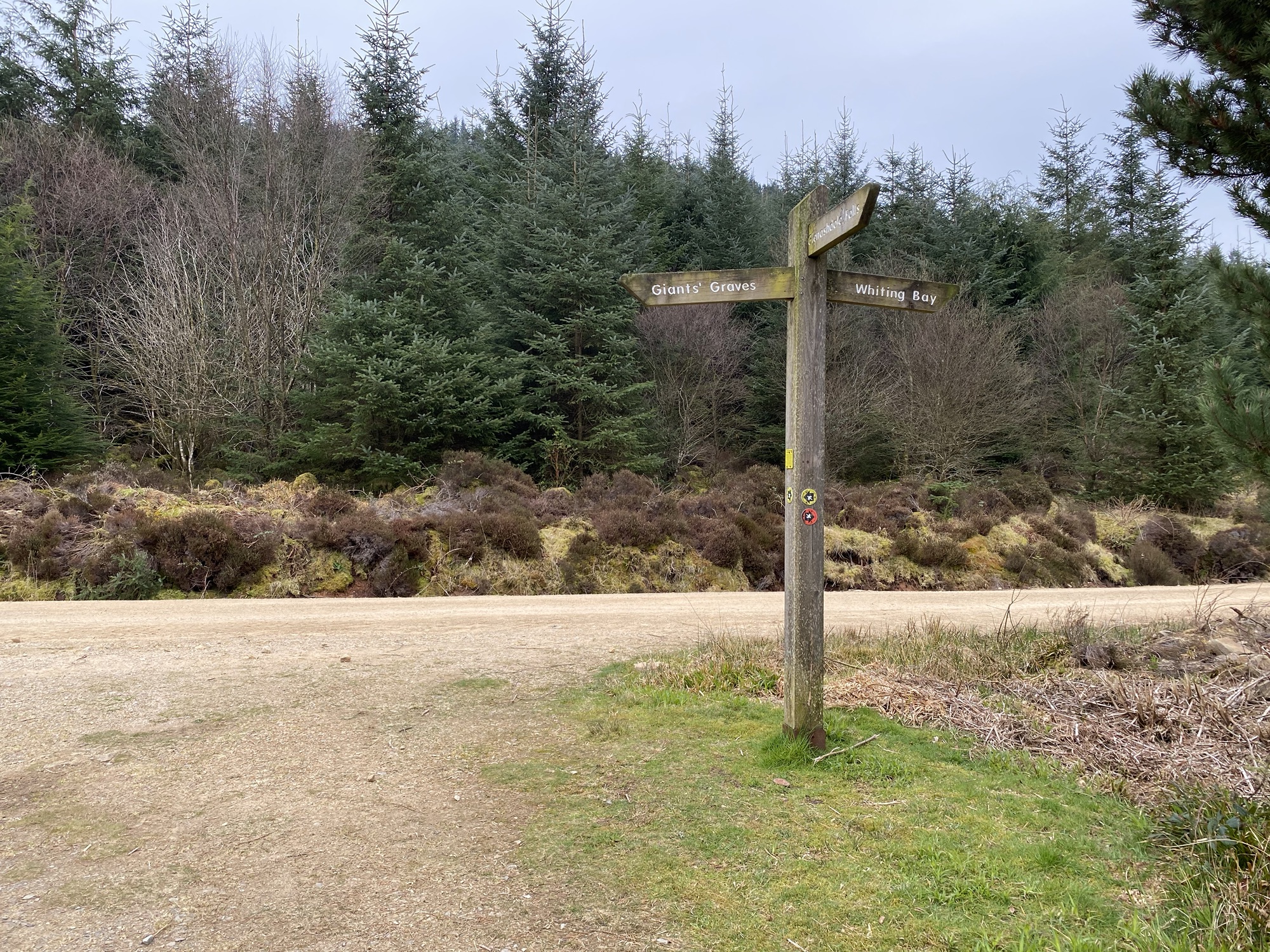 After admiring the falls I head down the forestry road towards a Neolithic burial site known as the Giants Graves. Although the road itself is an ugly scar on the landscape there are some reasonable views through the trees down to Whiting Bay and along the coastline.