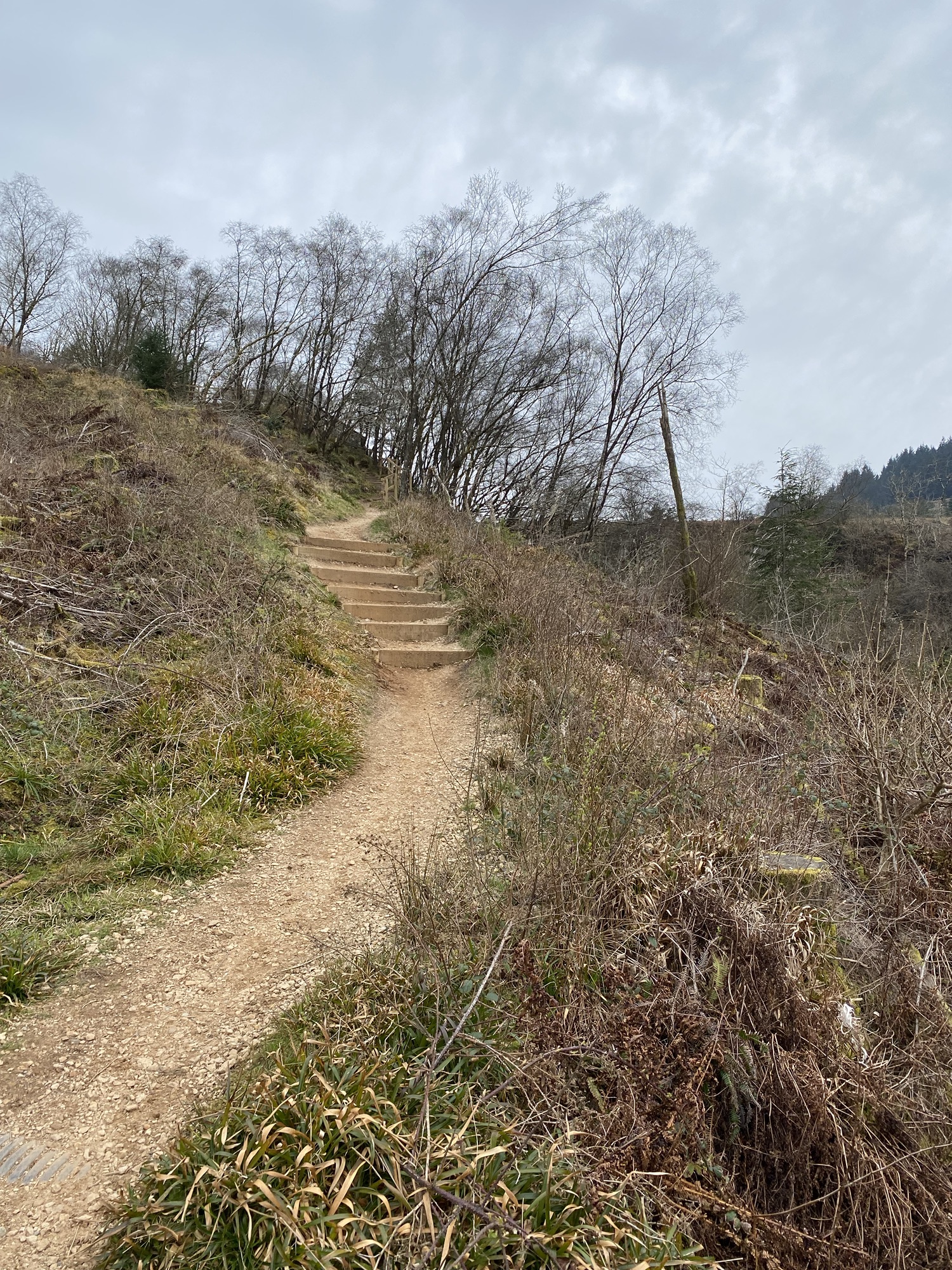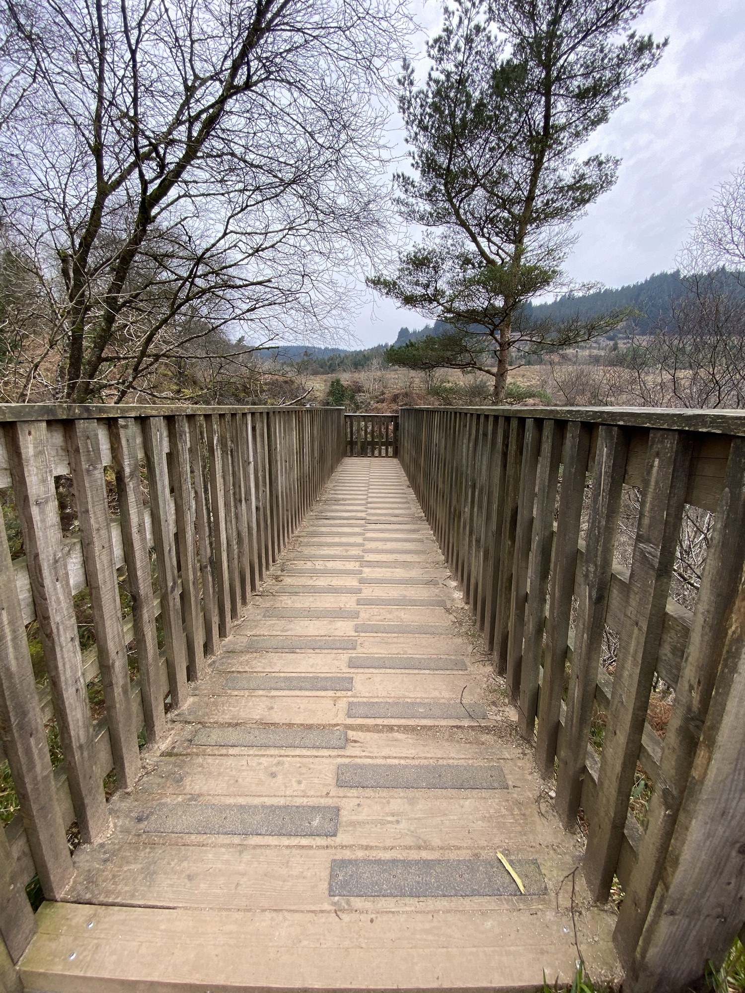 The gradient gradually increases and higher up it appears some serious tree felling has taken place leaving the hillside looking quite bare. The glen narrows and gets steeper as the falls get closer but before long I have reached the wooden viewing platform that gives an airy view over to the waterfall.