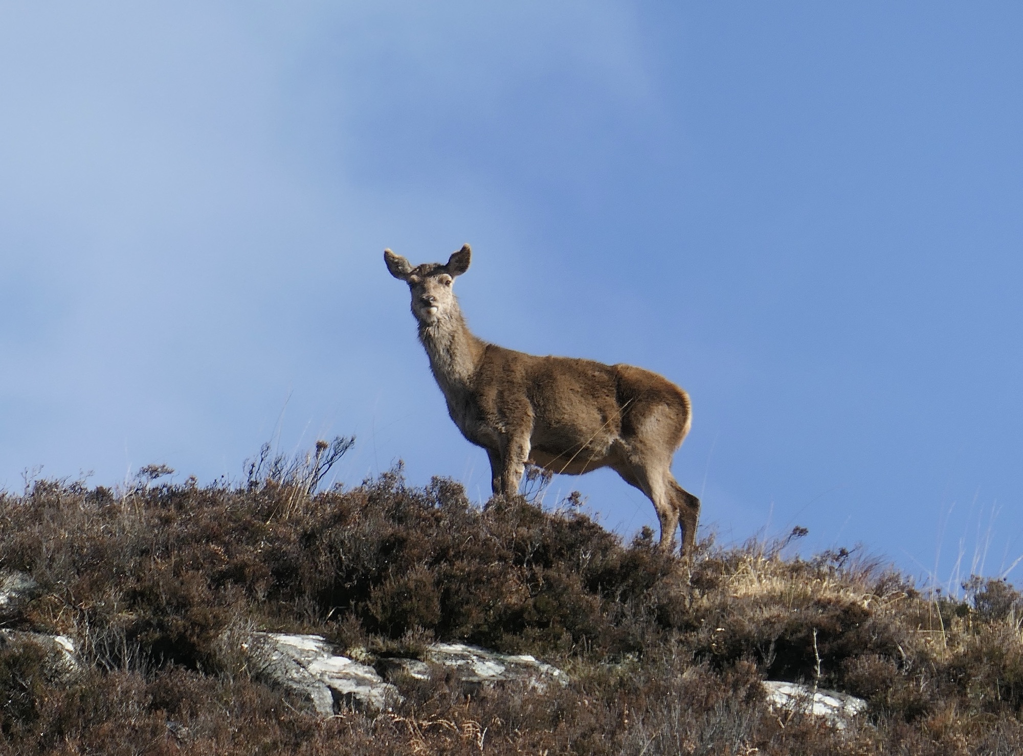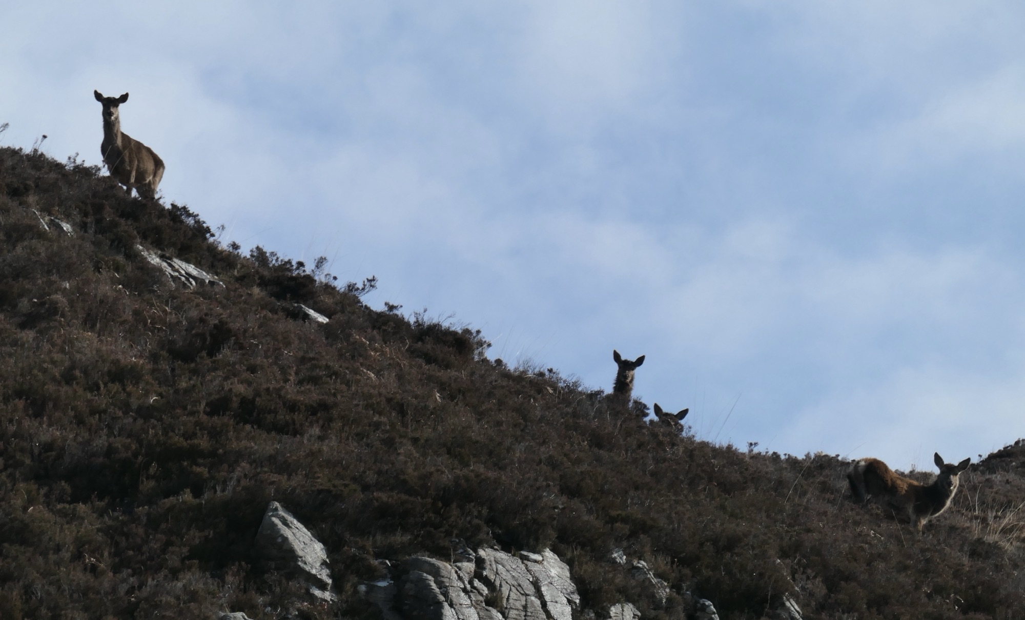 Before long I get the feeling I’m being watched and sure enough when I raise my eyes to the skyline four or five female red deer are keeping their eye on me from the top of a ridge. I think they quickly make the assessment that this particular human is not going to cause them any harm and return to munching away on the heather.