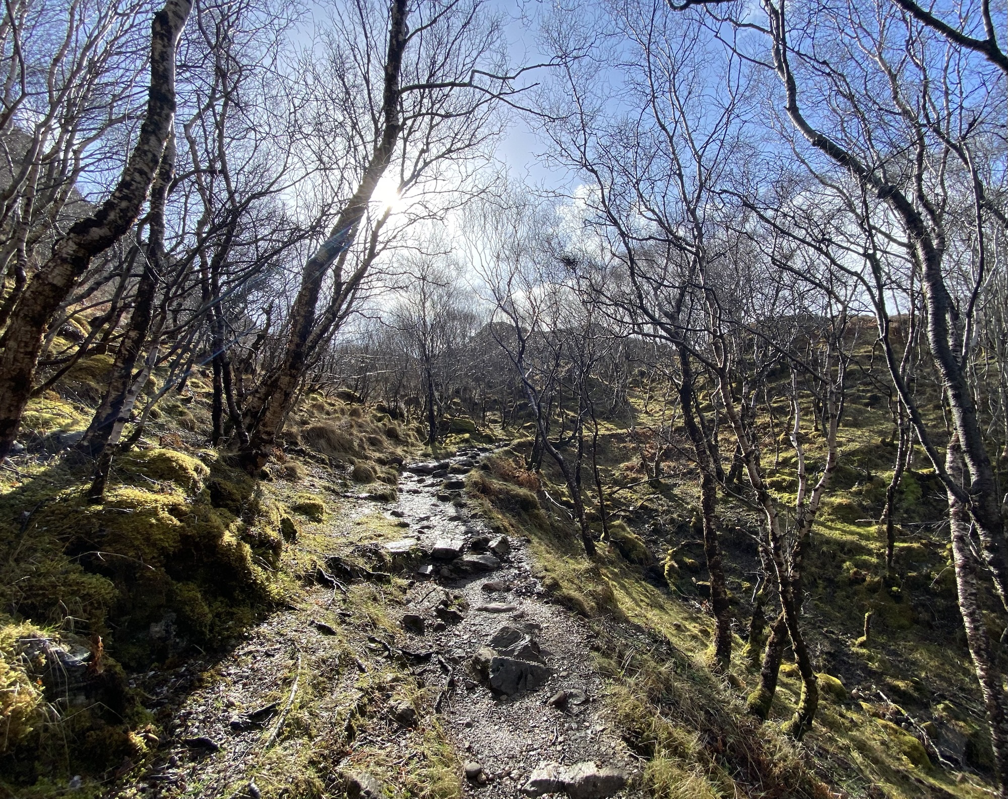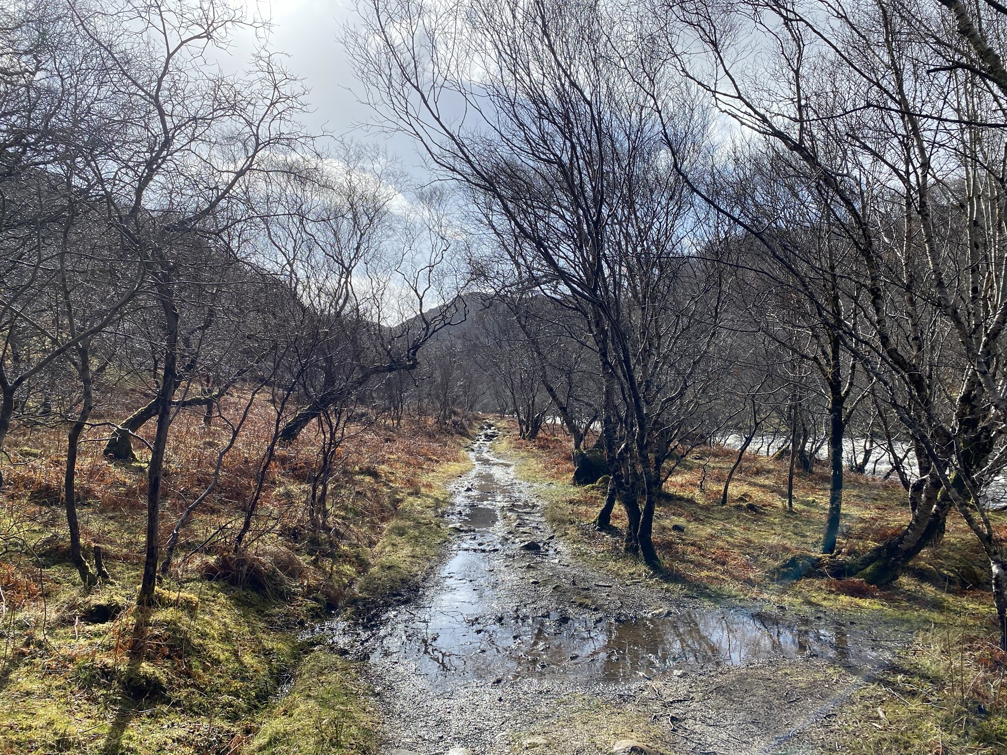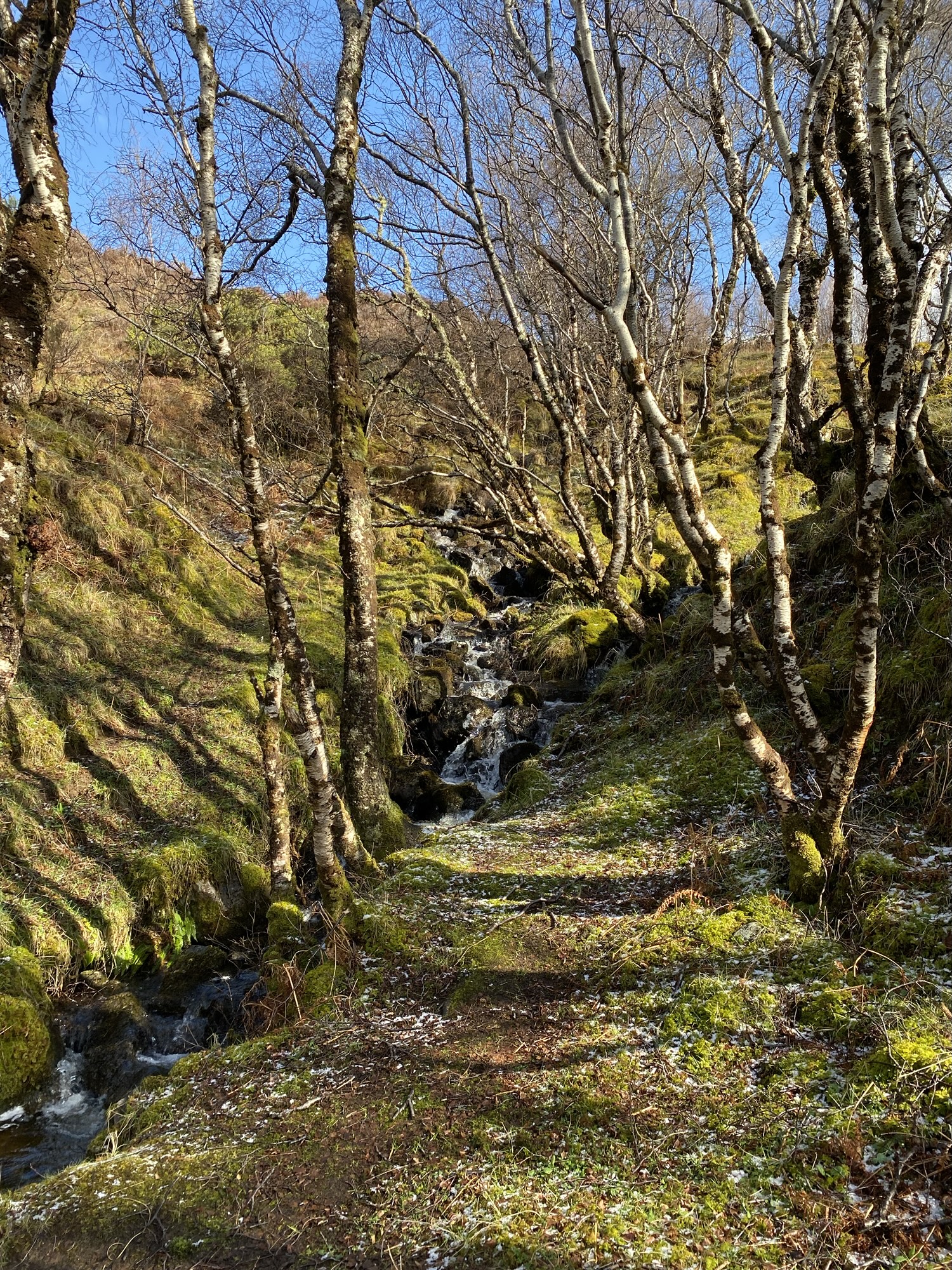 The incline increases as the path starts to diverge away from the river, which is narrowing into the gorge and heads up the hillside through silver birches with drops of icy water dripping from their skeletal branches, waiting for the warmth of spring when new life will return to them.