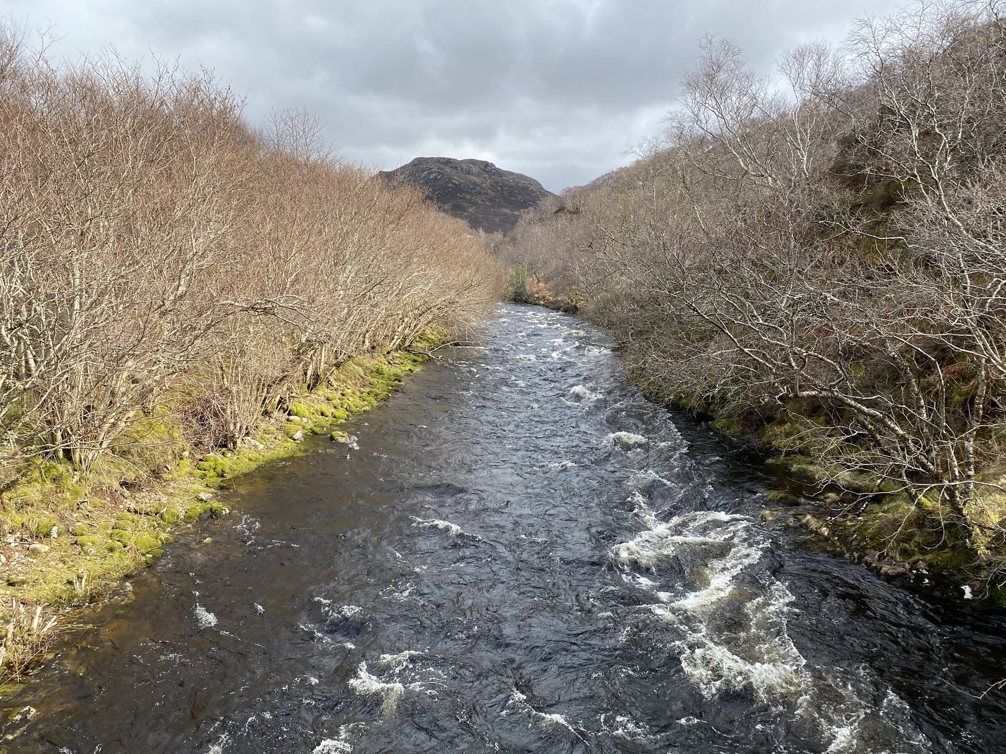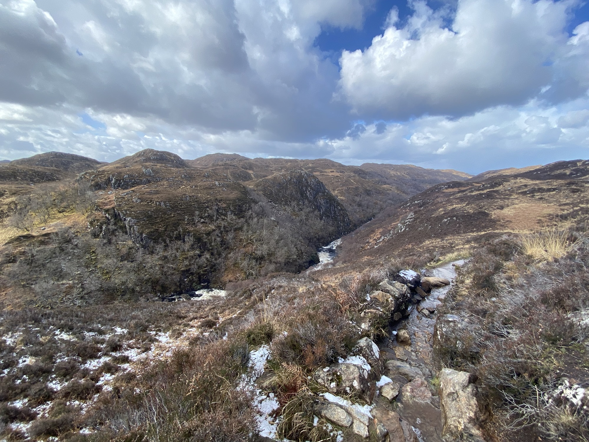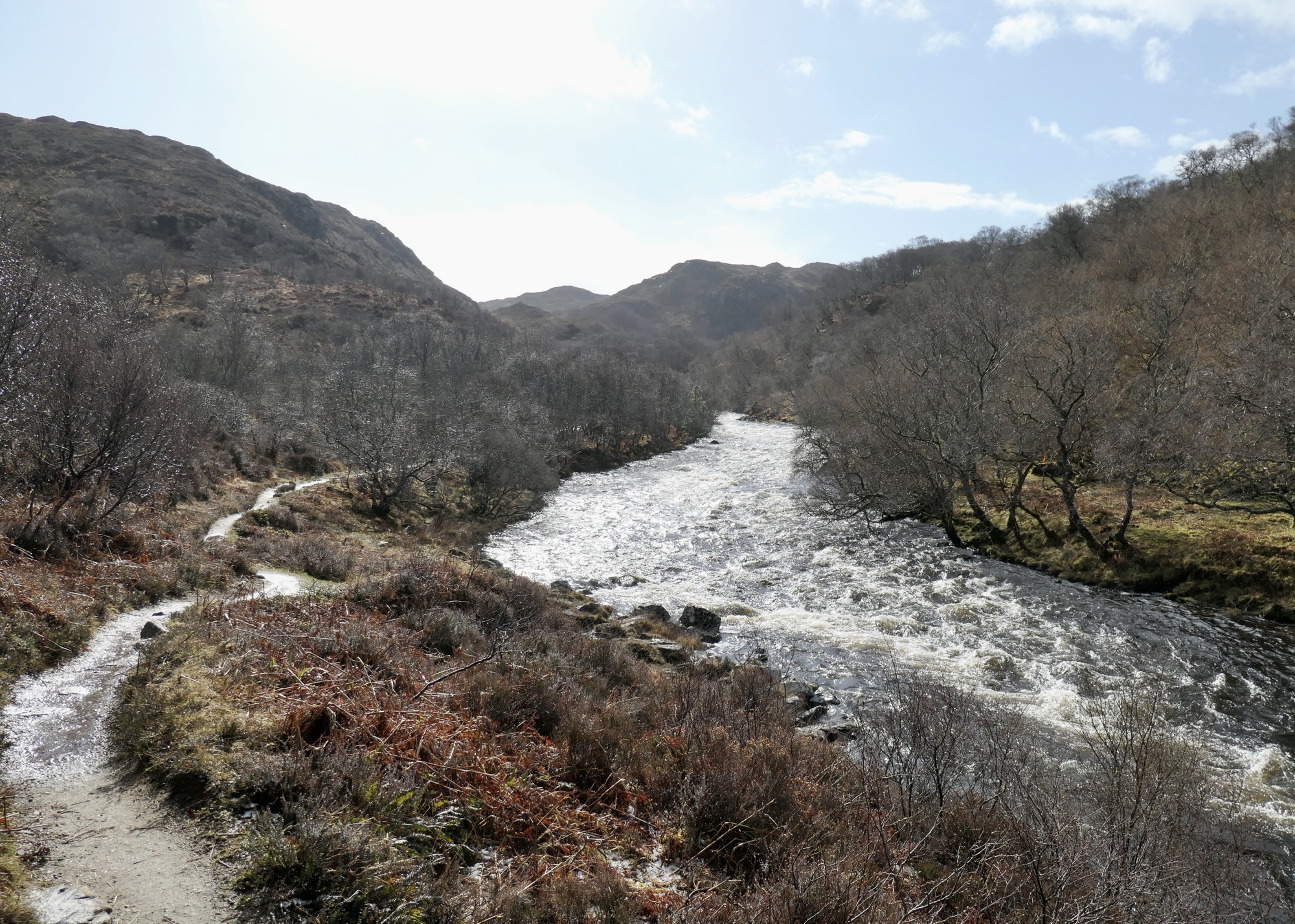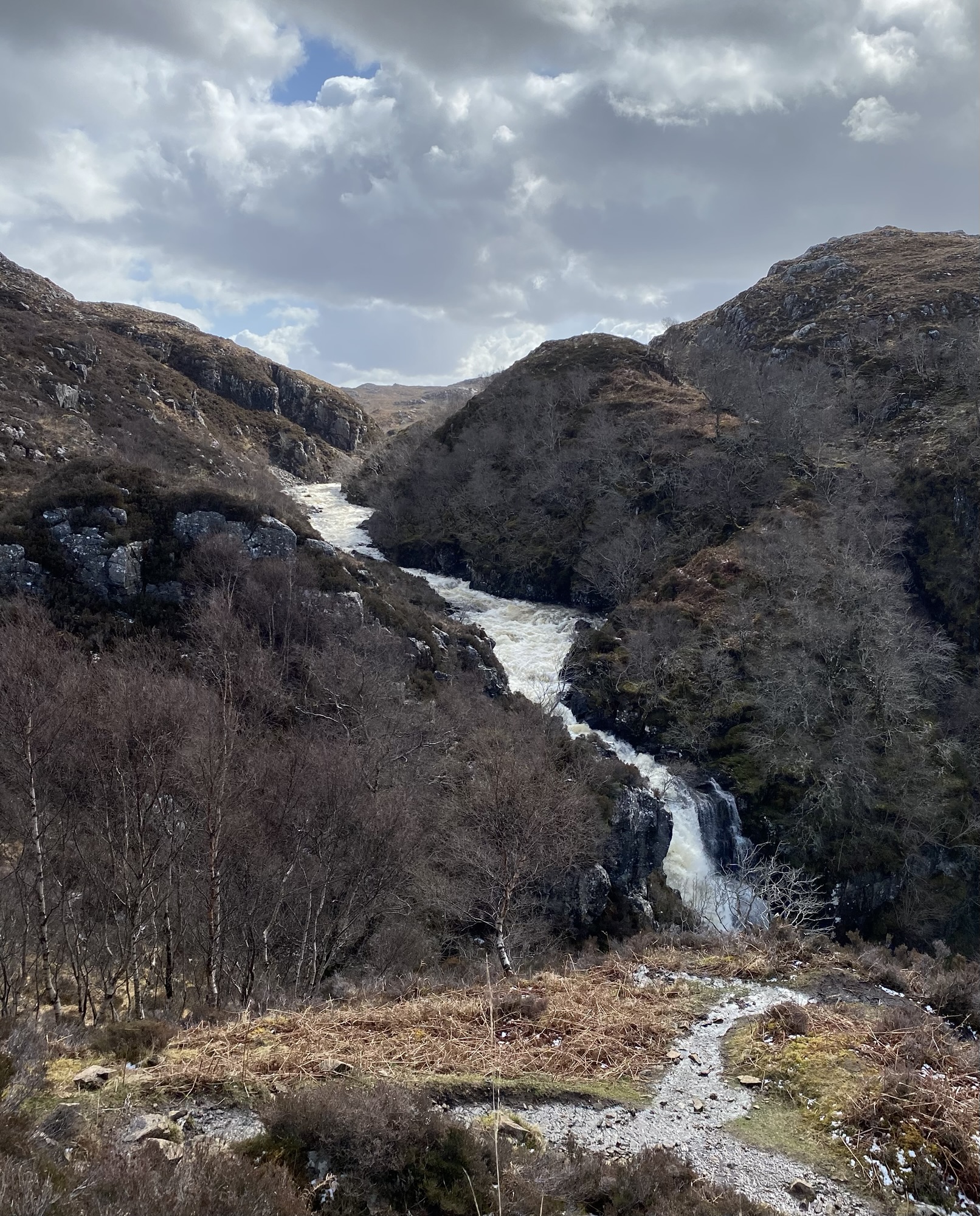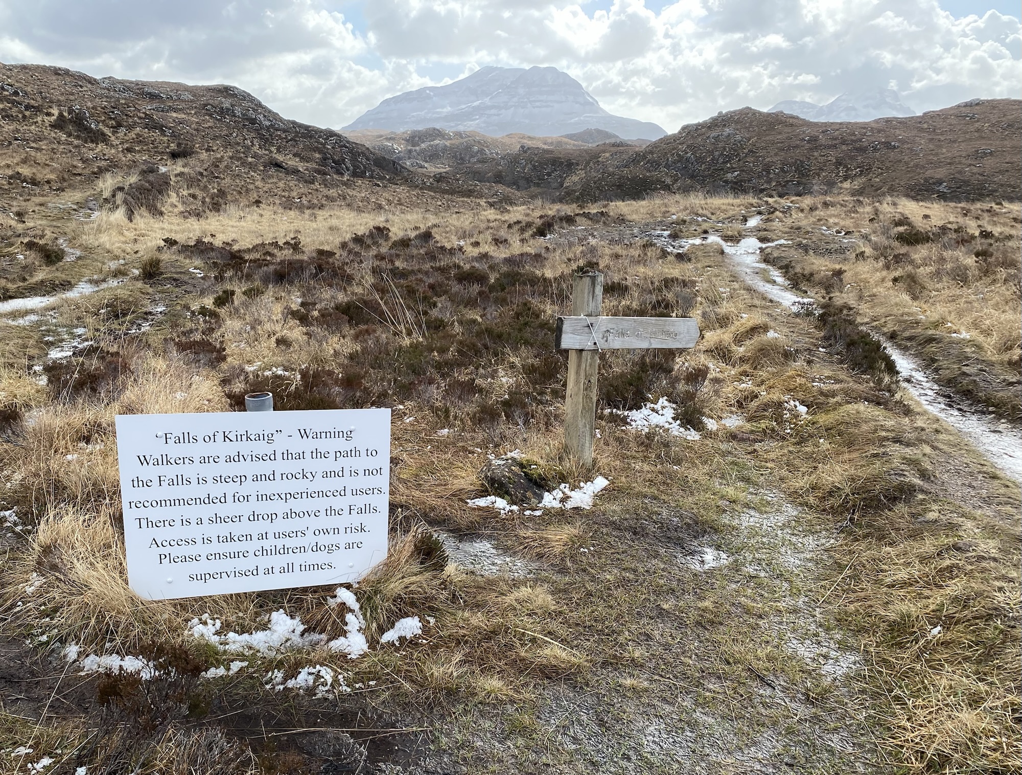 The trail heads through sparse leafless birch trees following close to the north bank of the Kirkaig river which is flowing full and fast down to Loch Kirkaig a few miles downstream. In the woods there is a sign warning that the path to the falls is steep and rocky with sheer drops. I make a mental note not to do anything stupid and carry on.