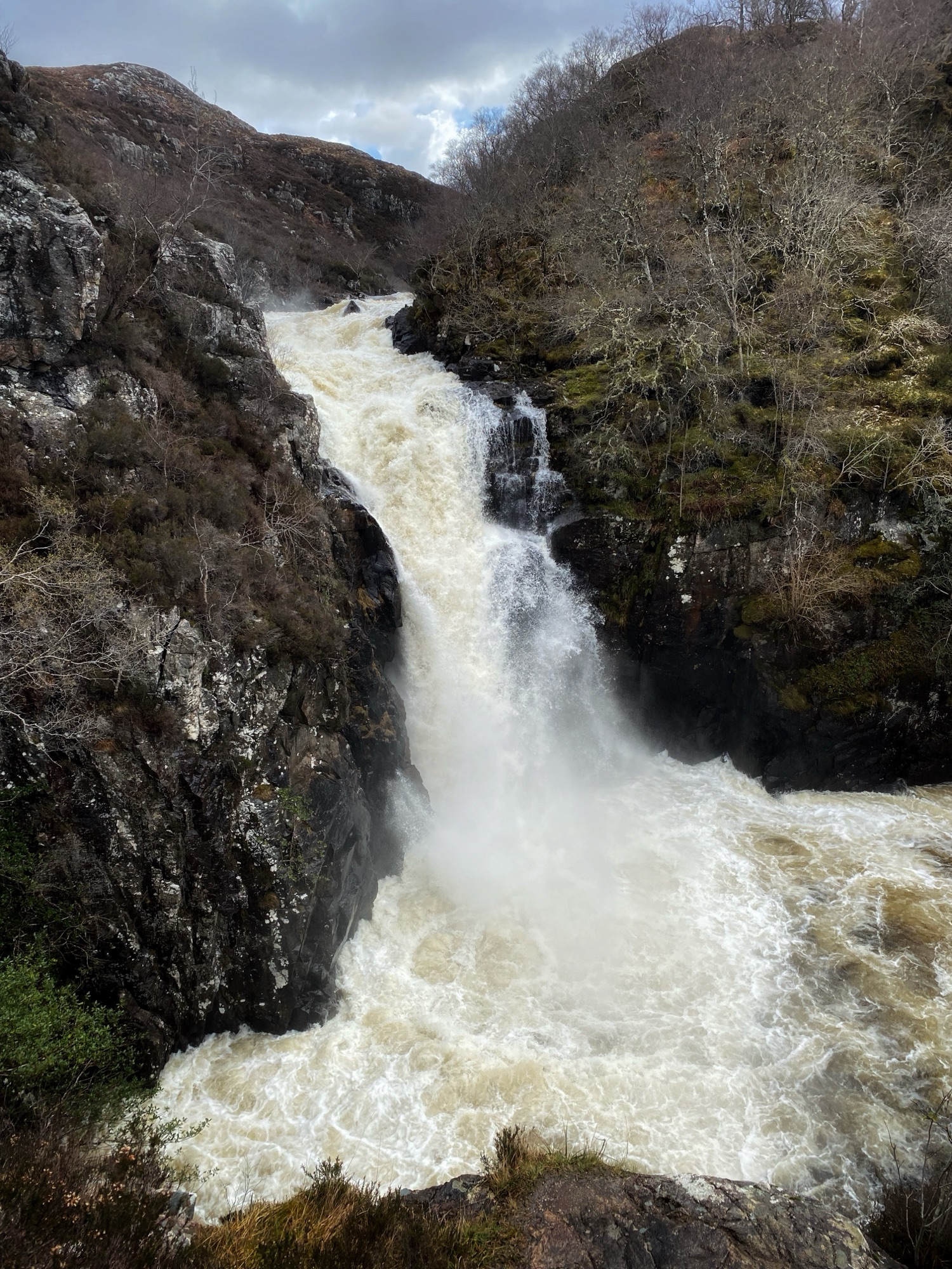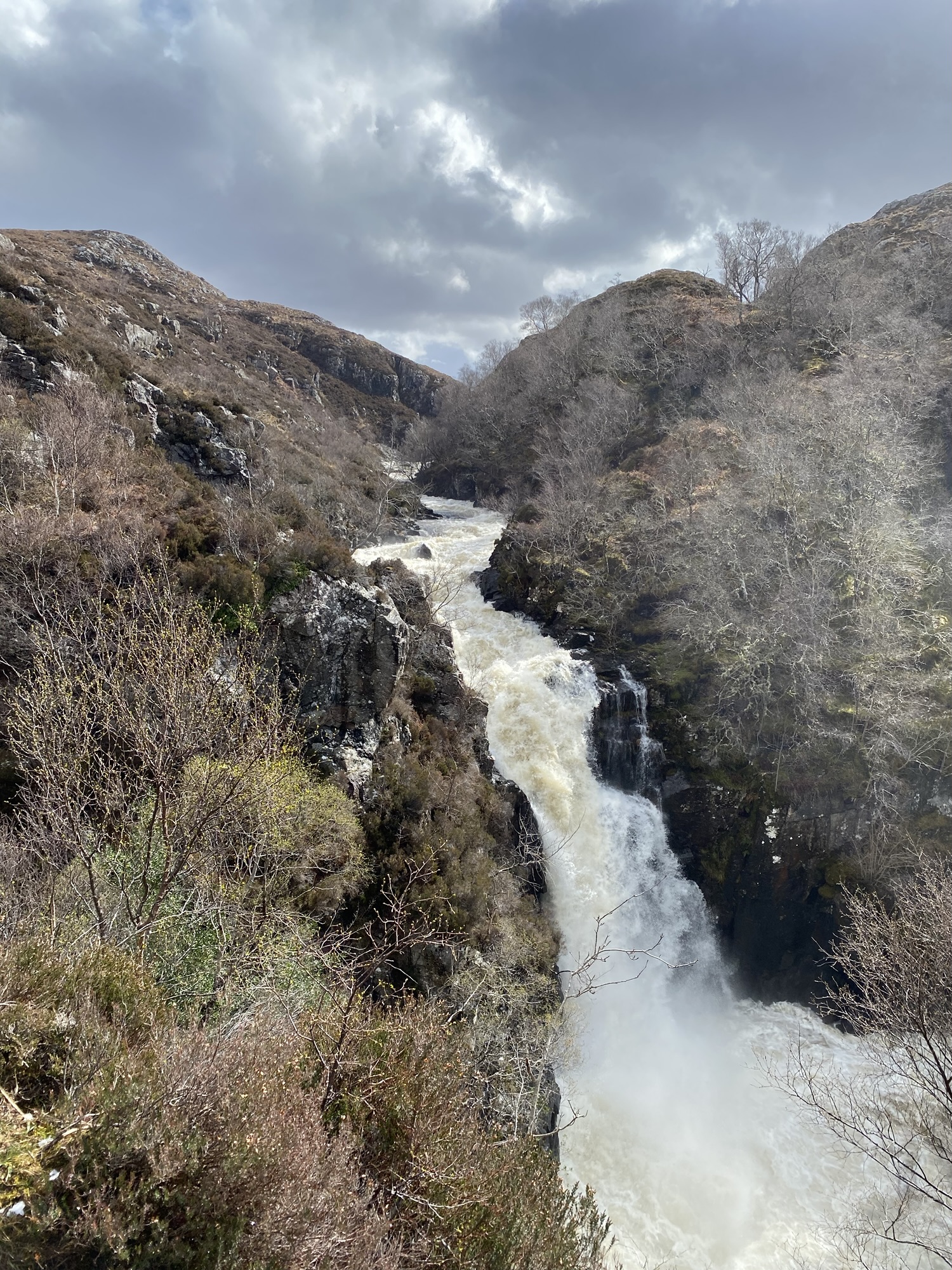 Kirkaig Falls I must say are pretty impressive, perhaps more so because they seem to be in full spate. Tons and tons of water pour over the edge, plummeting down twenty metres in a boiling mass of white watered ferociousness into a plunge pool below.