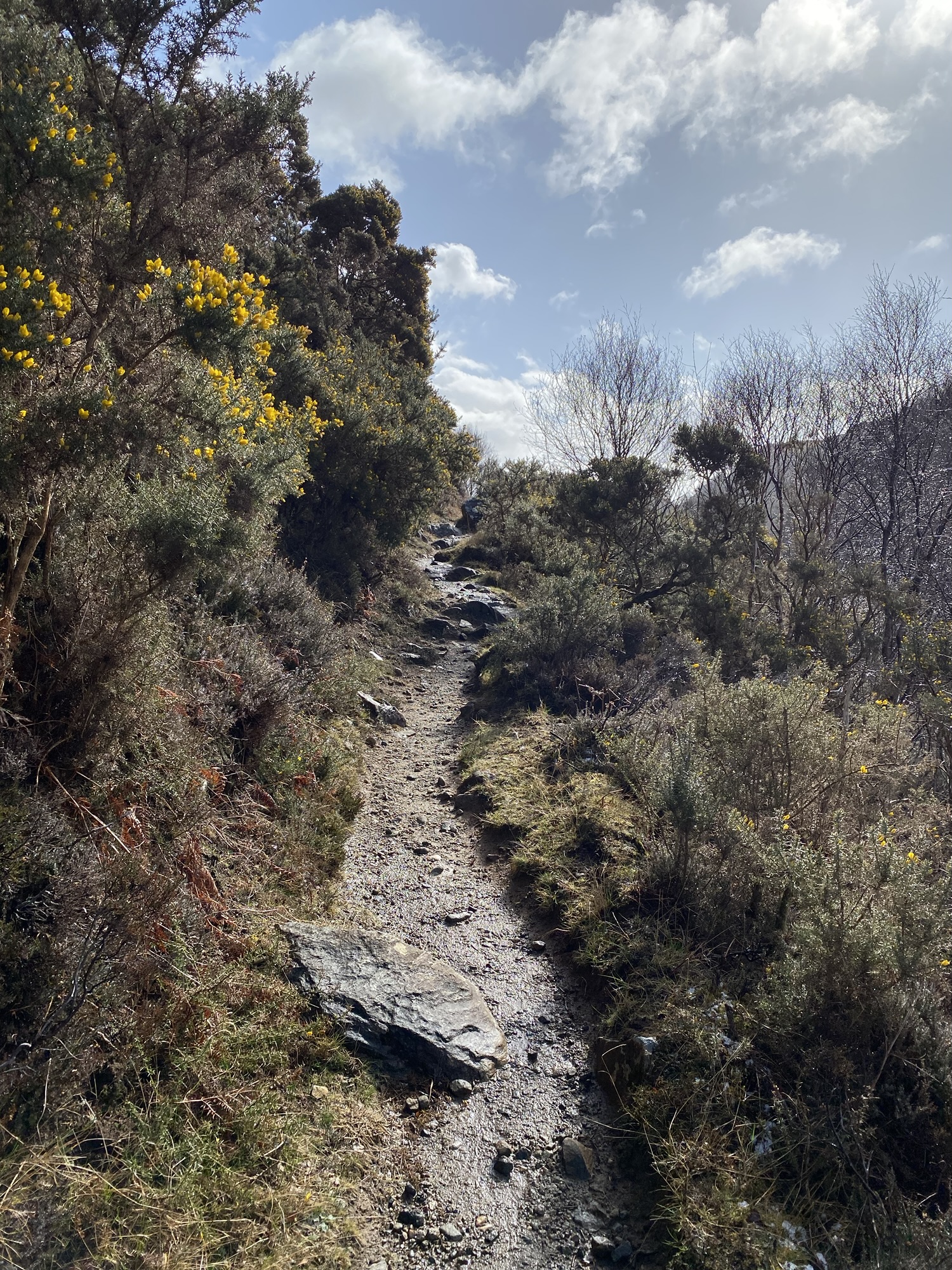 I continue upwards on a path lined by mossy banks and gorse bushes, the strengthening sunlight casting shadows on the ground and highlighting the green and yellows.