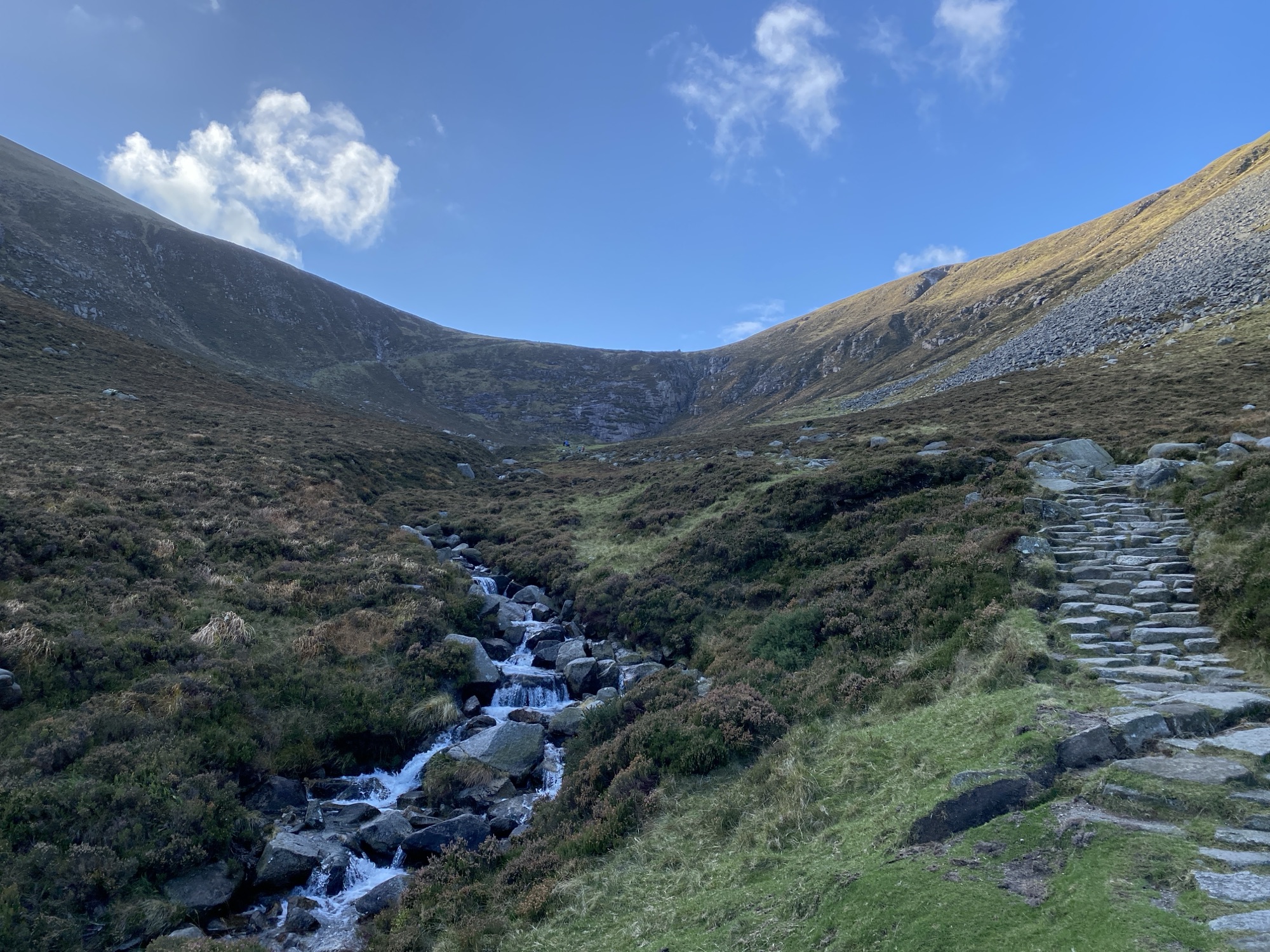 The walk up the valley is very enjoyable indeed with blue skies, sunshine, the tinkling river and an easy upward gradient on a superb path. At the head of the valley I can see the route heading diagonally up the valley side and onto the broad col between Slieve Donard and Slieve Commedagh.