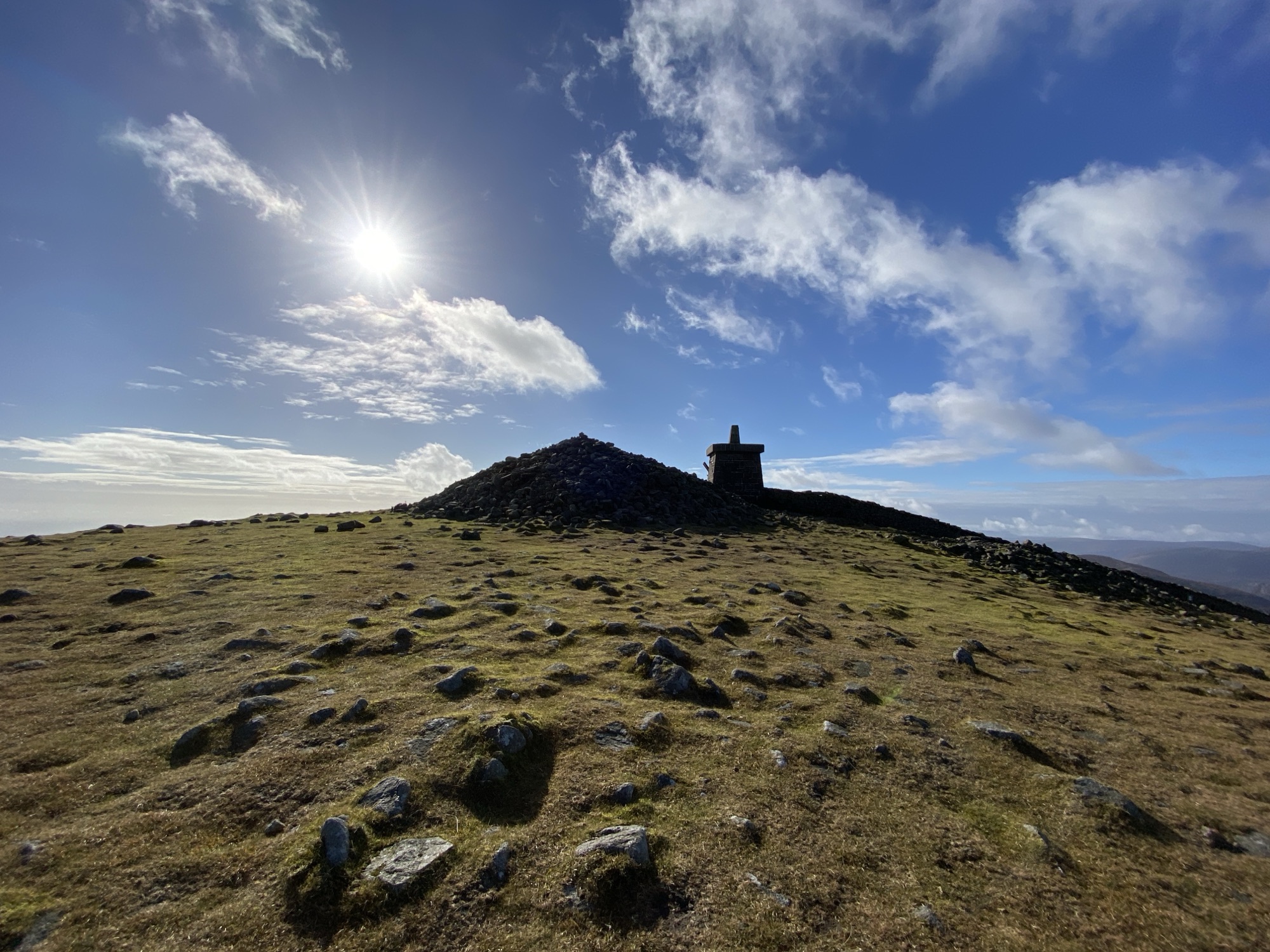 The Mourne Wall turns 90° to the right on the summit, heading off towards the Disney-esque named Rocky Mountain. At the turn sits a tower with the summit trig point planted on top of it. The tower was built at the same time as the wall by the same people, The Belfast Water Commissioners, but using mortar and provides a shelter from the elements as well as being a viewpoint.