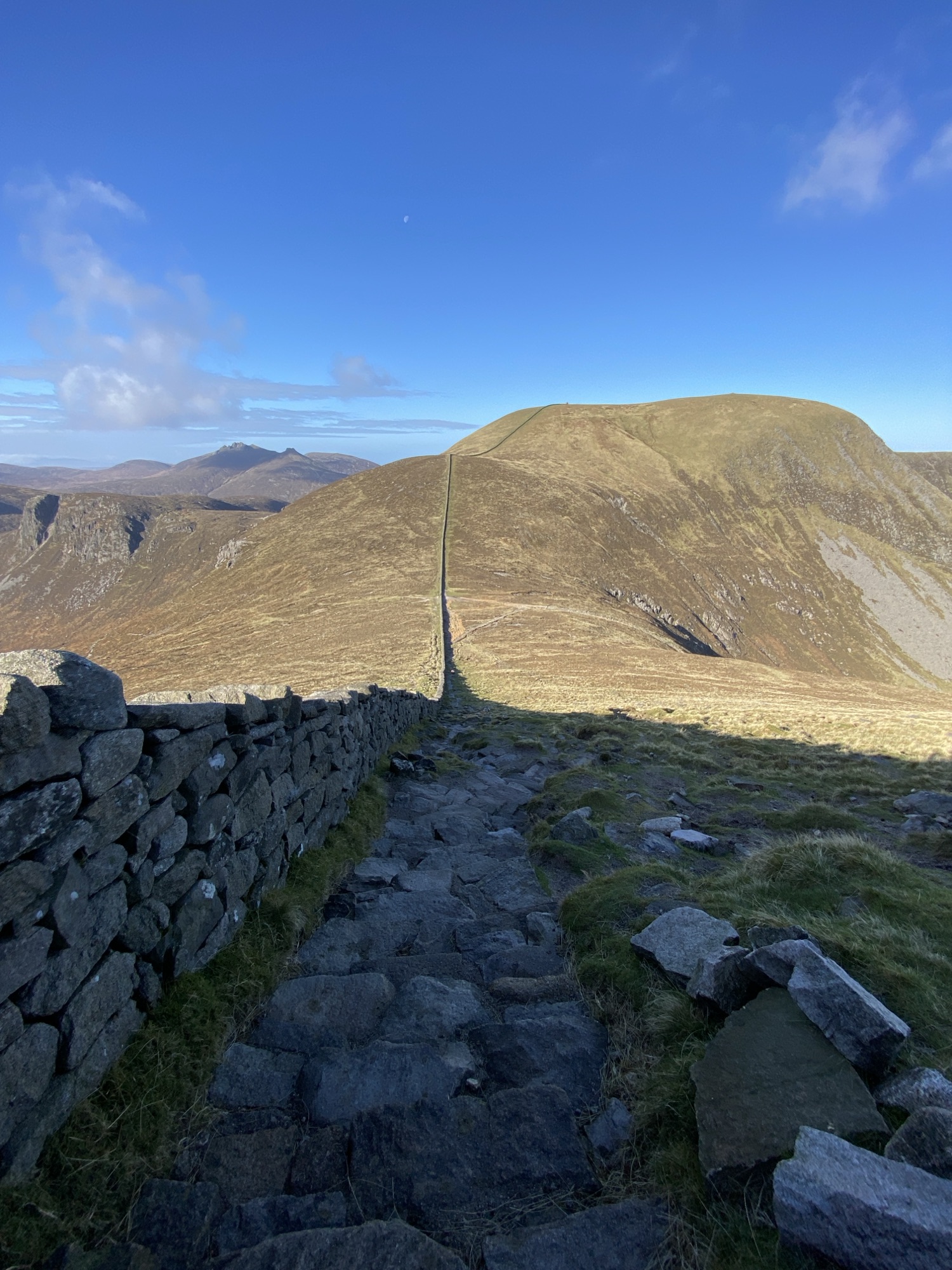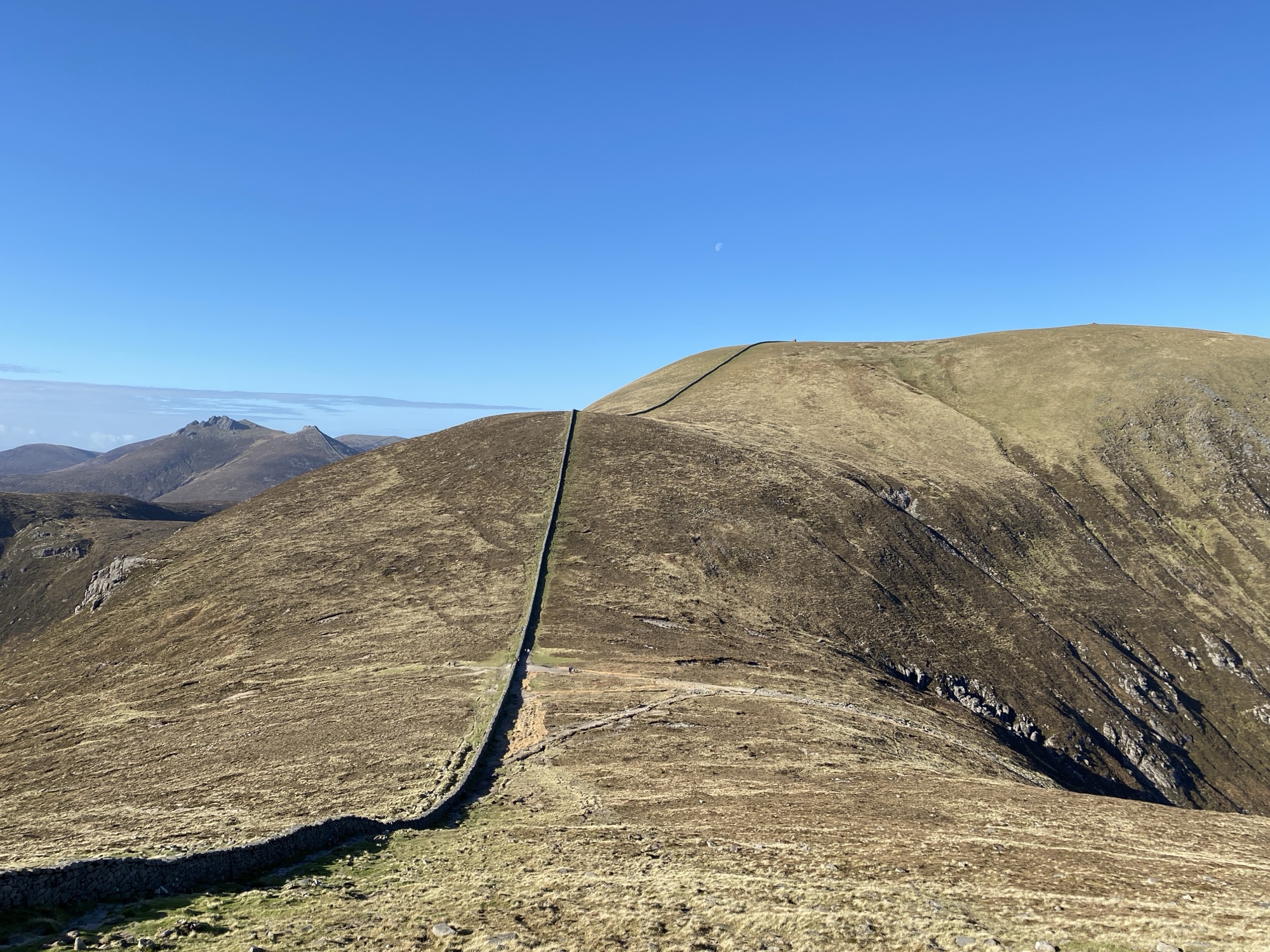The path so far has been one long and consistently steady incline. The path up the valley side is slightly steeper but the top of the col is soon reached and I find myself standing next to the mightily impressive looking and solidly built Mourne Wall which stretches upwards, like some great stone roller coaster track, straight as an arrow all the way to the summit.