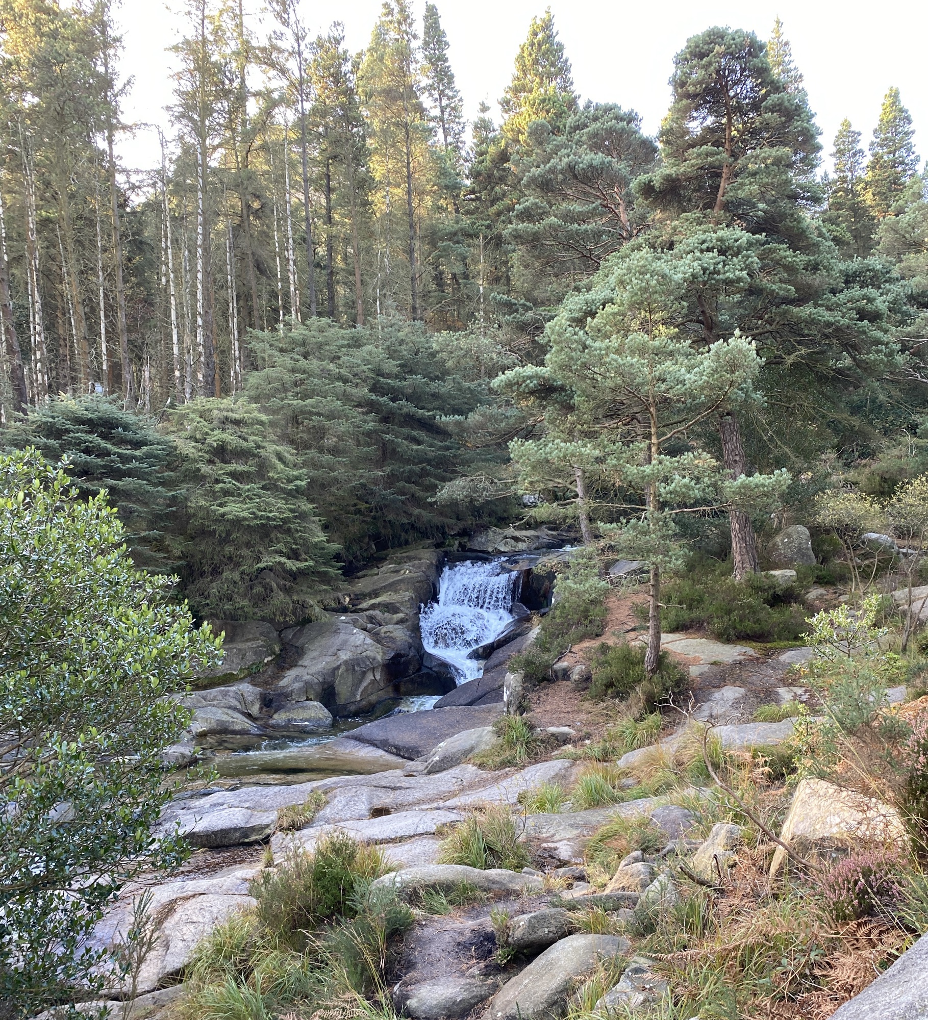 The route goes through Donard park, passing a quite magnificent Oak tree and then upwards through woodland to Donard Bridge, built in 1835. I cross the bridge and a stone laid track heads up through the thick woods of Donard forest following the Glen river. There are several impressive waterfalls along this stretch and noting the warning signs about dangerous overhangs I tread carefully to the waters edge to admire the sight and sound of tons of crystal clear water pouring down over huge rock slabs and swirling in rock pools.
