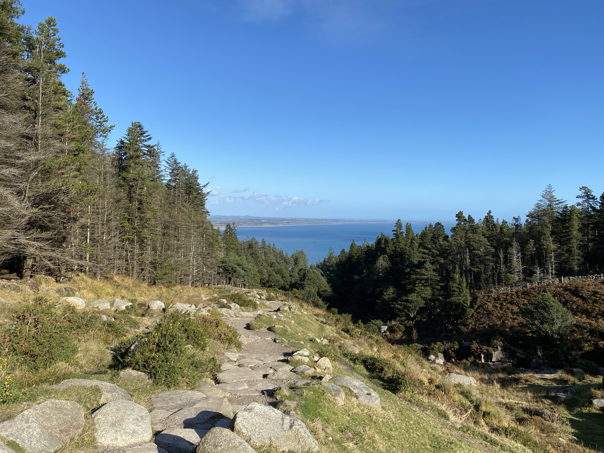 Some tree felling seems to have recently taken place which has churned up the path into a rocky, muddy mess. Looking behind me though, the long graceful curve of Dundrum Bay has started to come into view with lines of whitecap waves queuing up to roll rhythmically onto the wide Sandy beach.