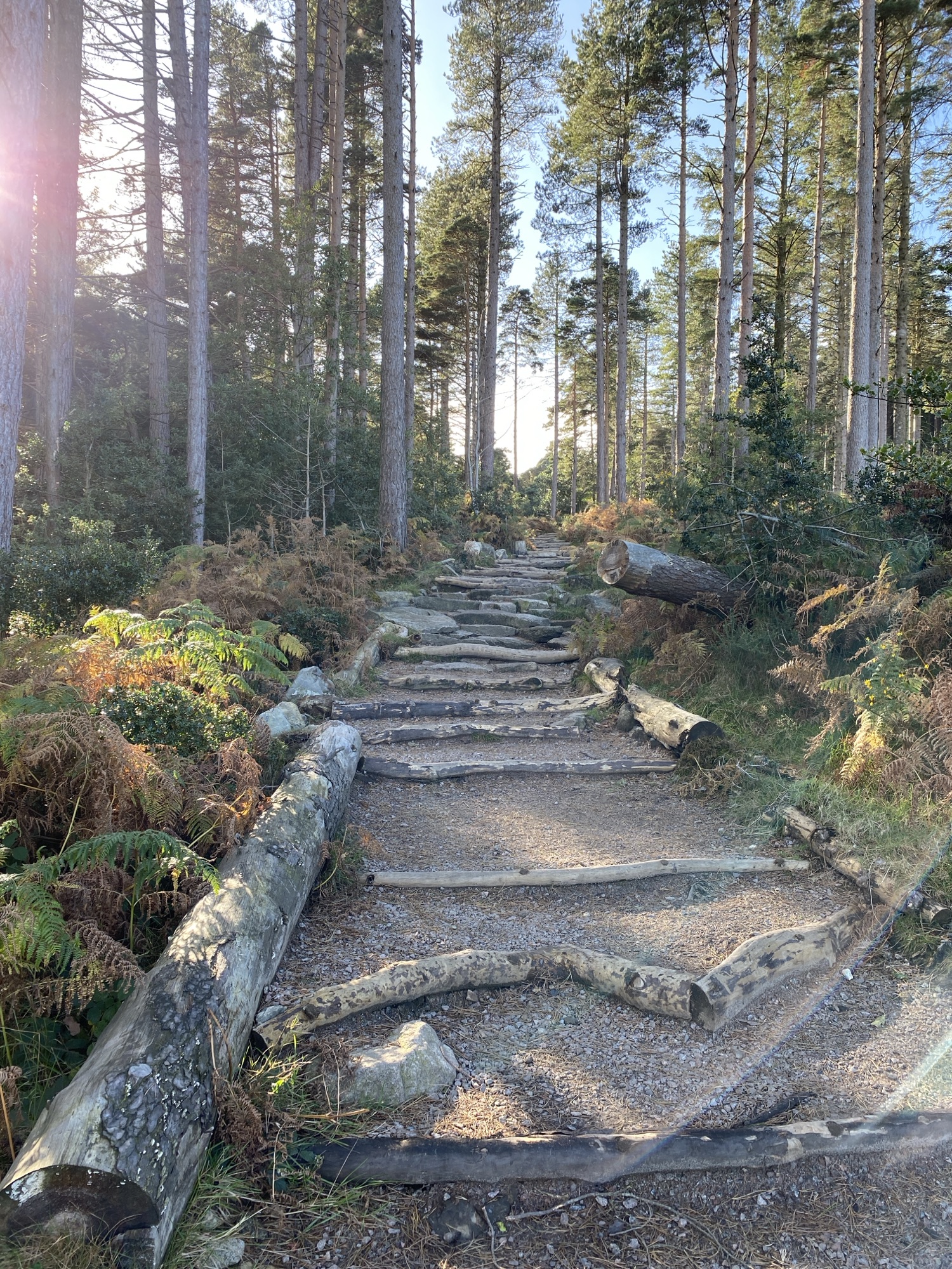 The rough terrain doesn’t last long and soon turns into a very pleasant gravel track, layered and lined by logs that leads upwards through ramrod straight Scots pines. Bridge number three is met but not crossed and height continues to be gained along an excellent and delightful stone laid and gorse lined track surrounded by lush mature woodland and shrubbery that was planted in the 1920’s.