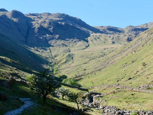 I’m not going back now though, so I gird up my loins and take a slow and steady step by step down, thankful for the stability my poles provide. Towards the bottom the steepness of the slope eases into the kinder gradient of the valley side and eventually I reach the main Sty Head path which takes me back down to Stockley Bridge past the small plantation of pines near Taylorgill Force which provide some brief respite from the relentless sun.