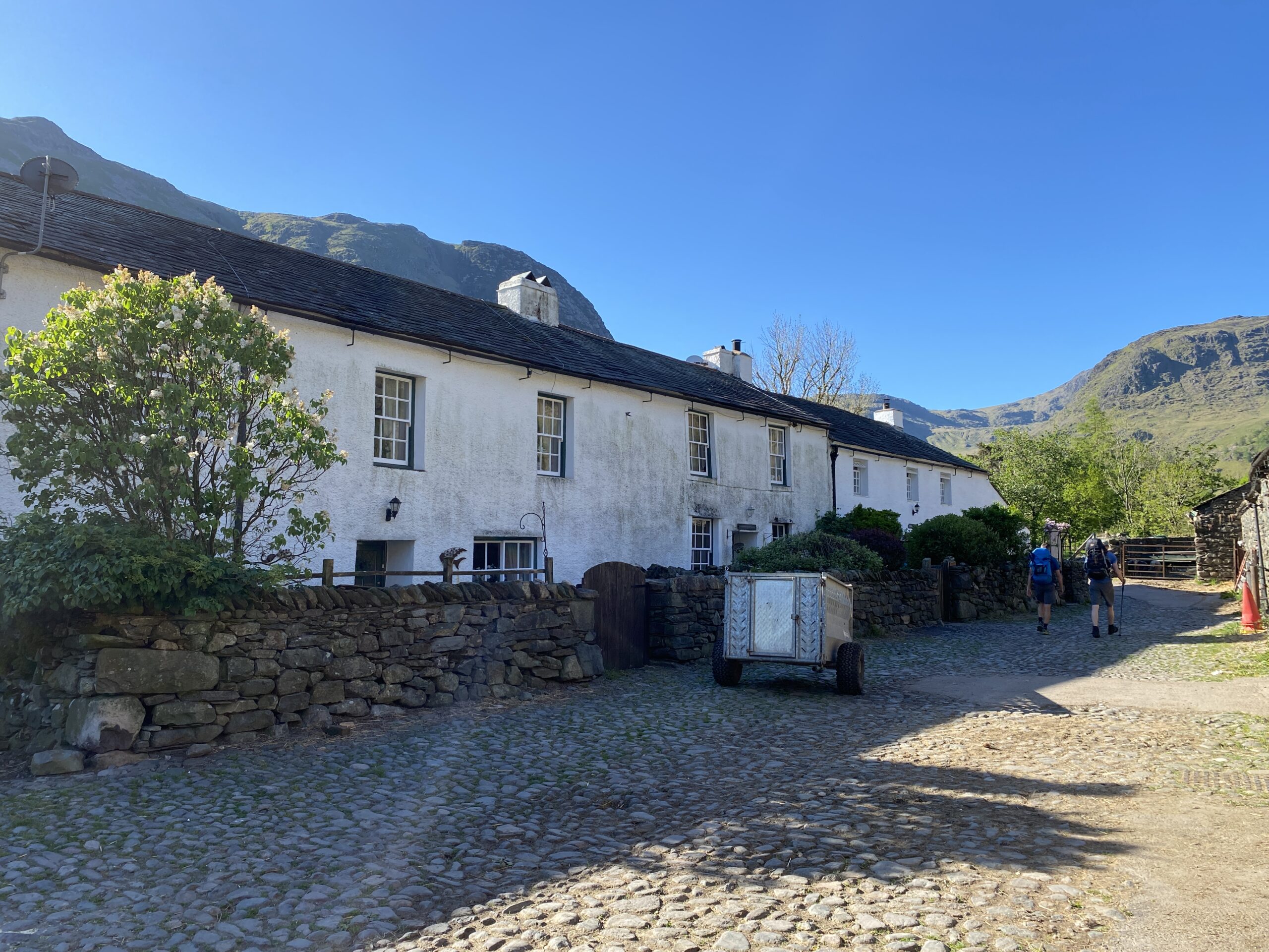 There has been a farm at Seathwaite since at least the 15th century, probably going back to the 10th when the Norsemen gave it its name. The whitewashed farm buildings are slightly newer, dating from from 1850’s. It’s a no nonsense working farm with manure piled up in the yard and dark sheds hiding mysterious shuffling occupants. A cobbled yard leads through the farm and out onto the ancient pack horse route leading to Wasdale.