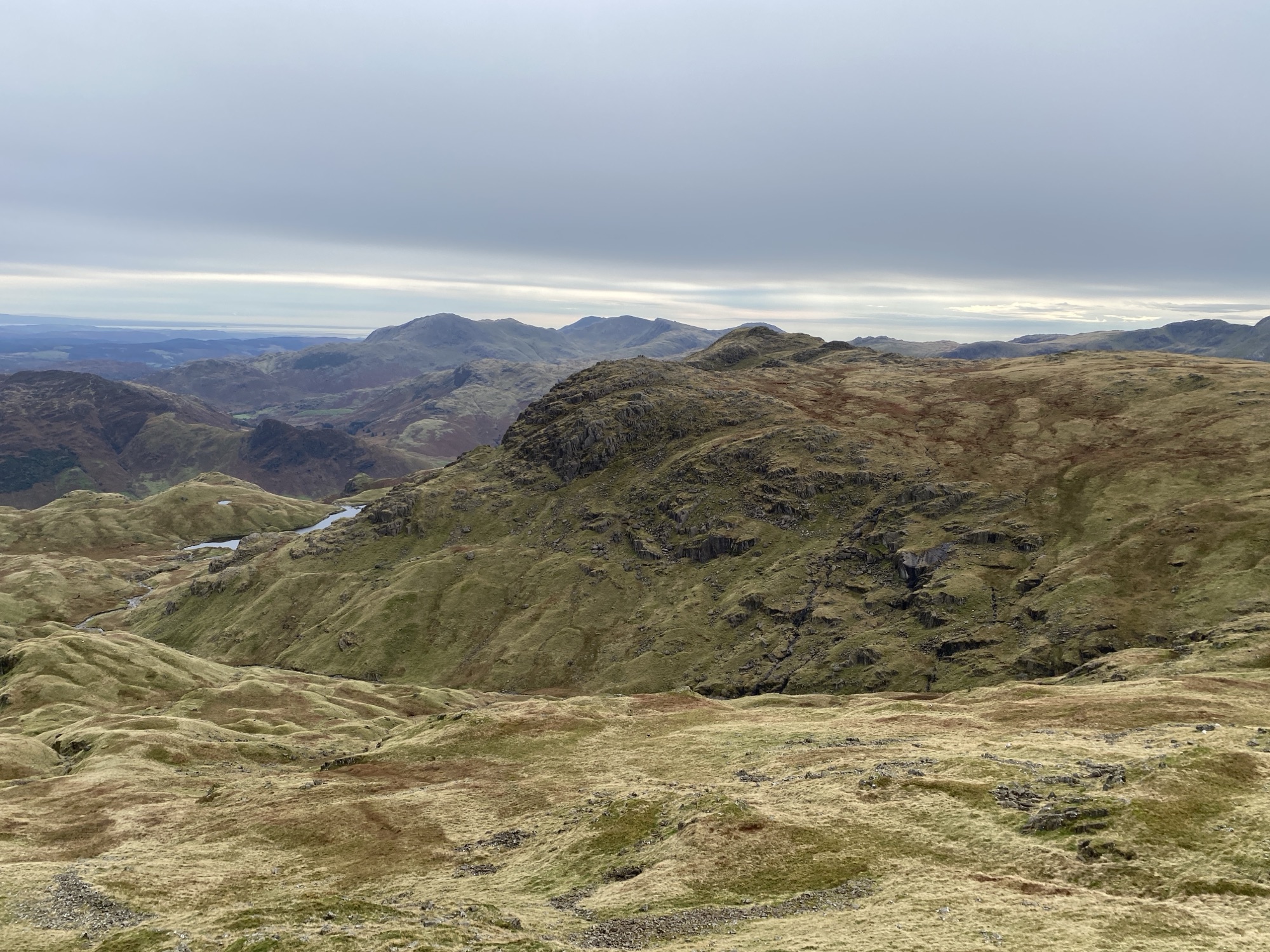 I’m back in Great Langdale just a couple of weeks after my previous visit when I was fortunate to walk the Langdale Pikes in glorious weather. The weather isn’t so good today but it’s dry and the tops are clear which is what matters. I’m heading for a group of hills that form an outer circle around the rather compact Pikes, Blea Rigg, Sergeant Man, High Raise and Thunacar Knott. And in visiting these, I’ll also bring to a conclusion my journey through Wainwright’s Book Three, The Central Fells.