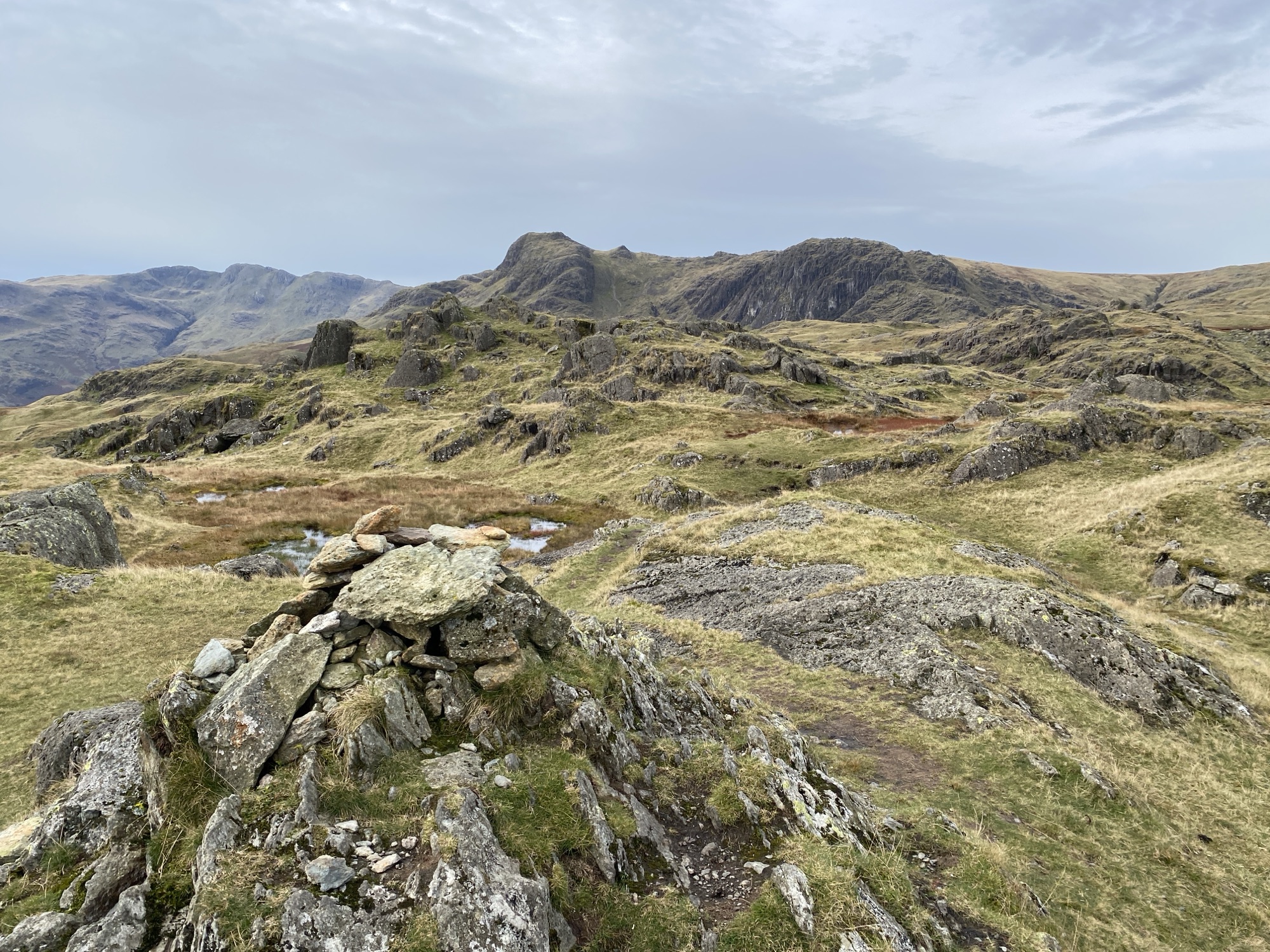 The track to Thunacar Knott is another long squelchy trek, mostly downhill across the grass heading back towards the Langdale Pikes. From its summit there is a good rear view of the Pikes although this is far less dramatic than the front view of them from the valley or Stickle Tarn.