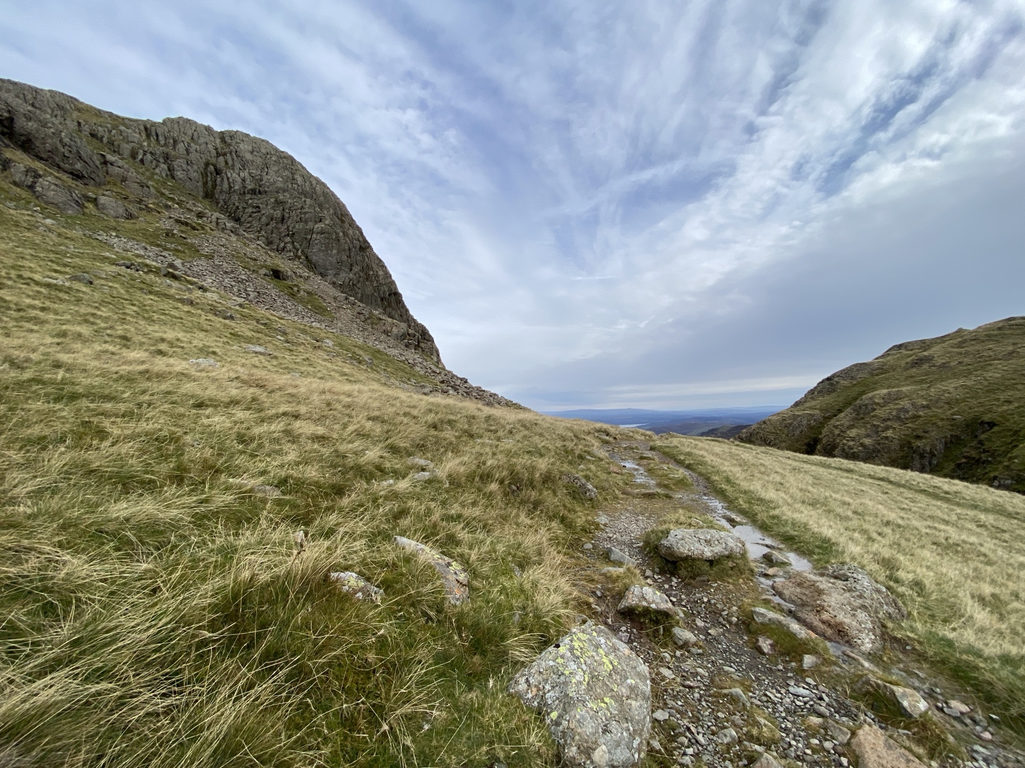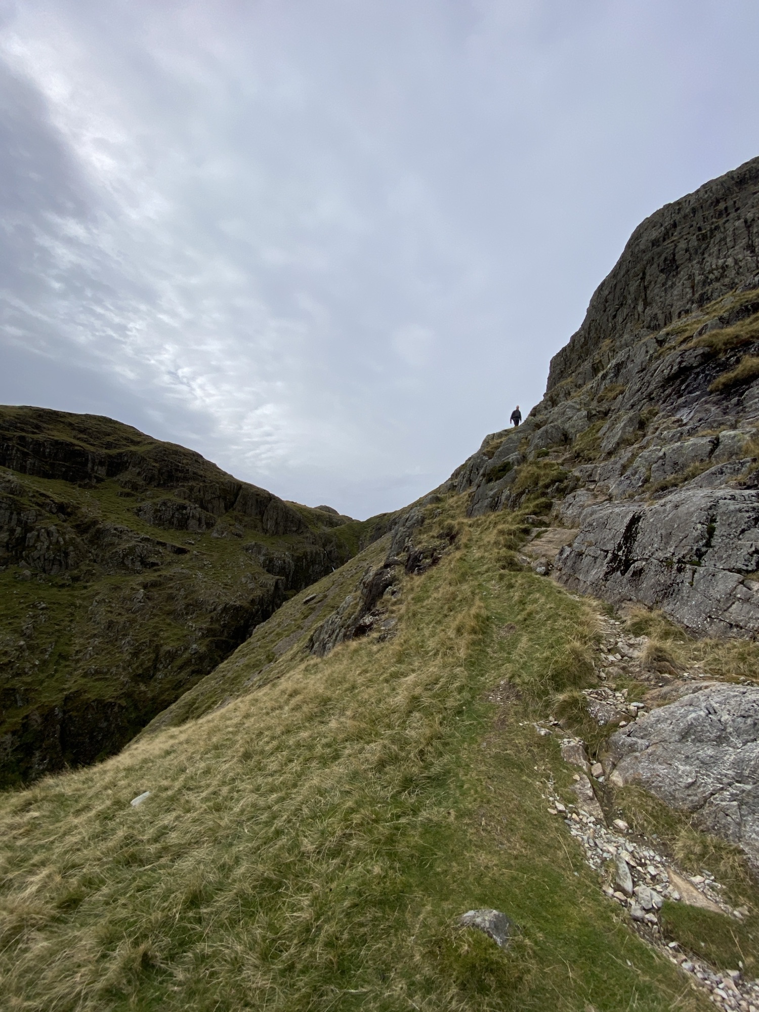 The path heads into Dungeon Ghyll and after a day of grass and hands in pocket gentle slopes it’s a shock to the system to suddenly find myself on a narrow ledged path with a plunging drop into Dungeon Ghyll to my right and the vertical crags of Harrison Stickle rising up to my left.