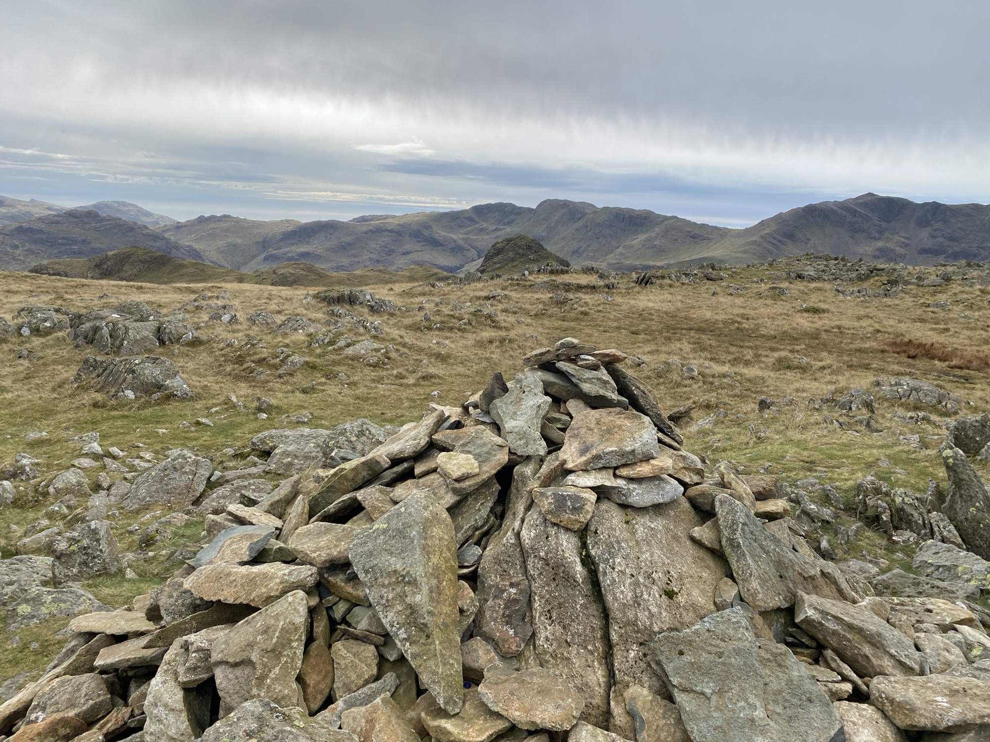The path winds its way across wet and undulating ground speckled with rocky outcrops until it climbs upwards to the cairned summit of Blea Rigg. The summit is merely the highest outcrop amongst many outcrops but the views beyond the foreground are extensive with Windermere, The Coniston Fells and the Helvellyn ridge, free of the cloud blanket that covered it two weeks ago, all vying for attention.