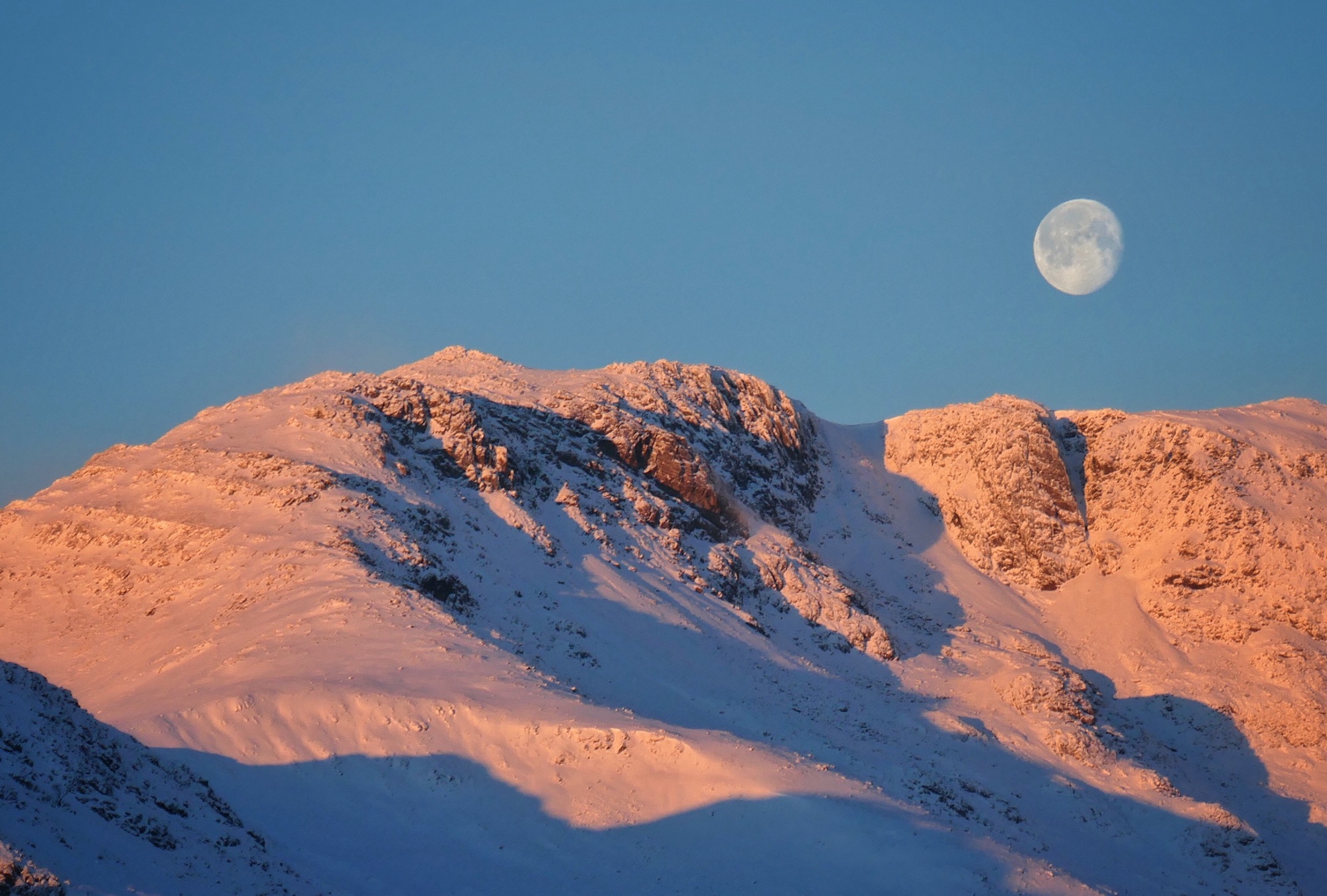 Pink snow sunrises in a cloudless sky as the moon goes to bed, its work done for the night
