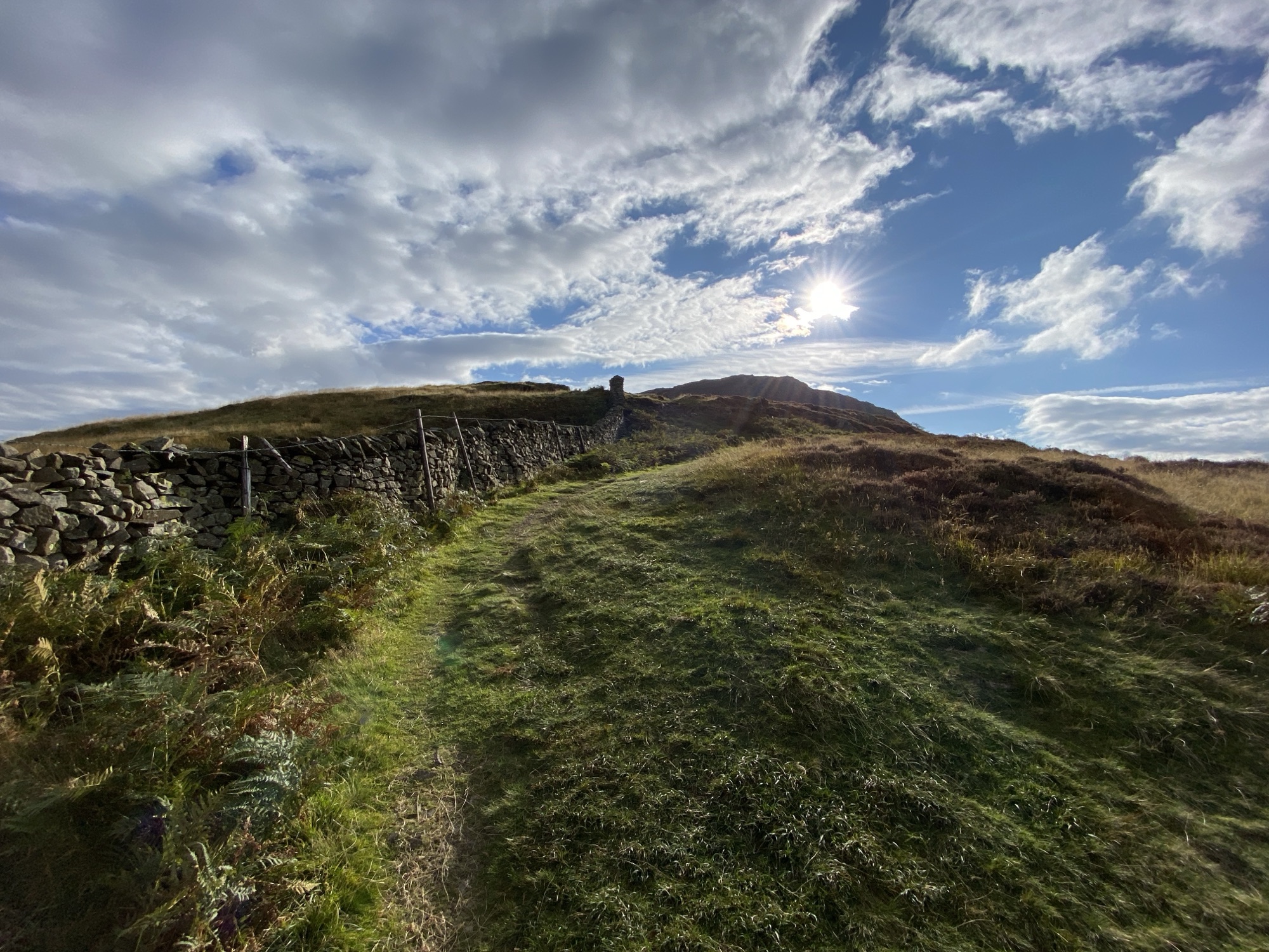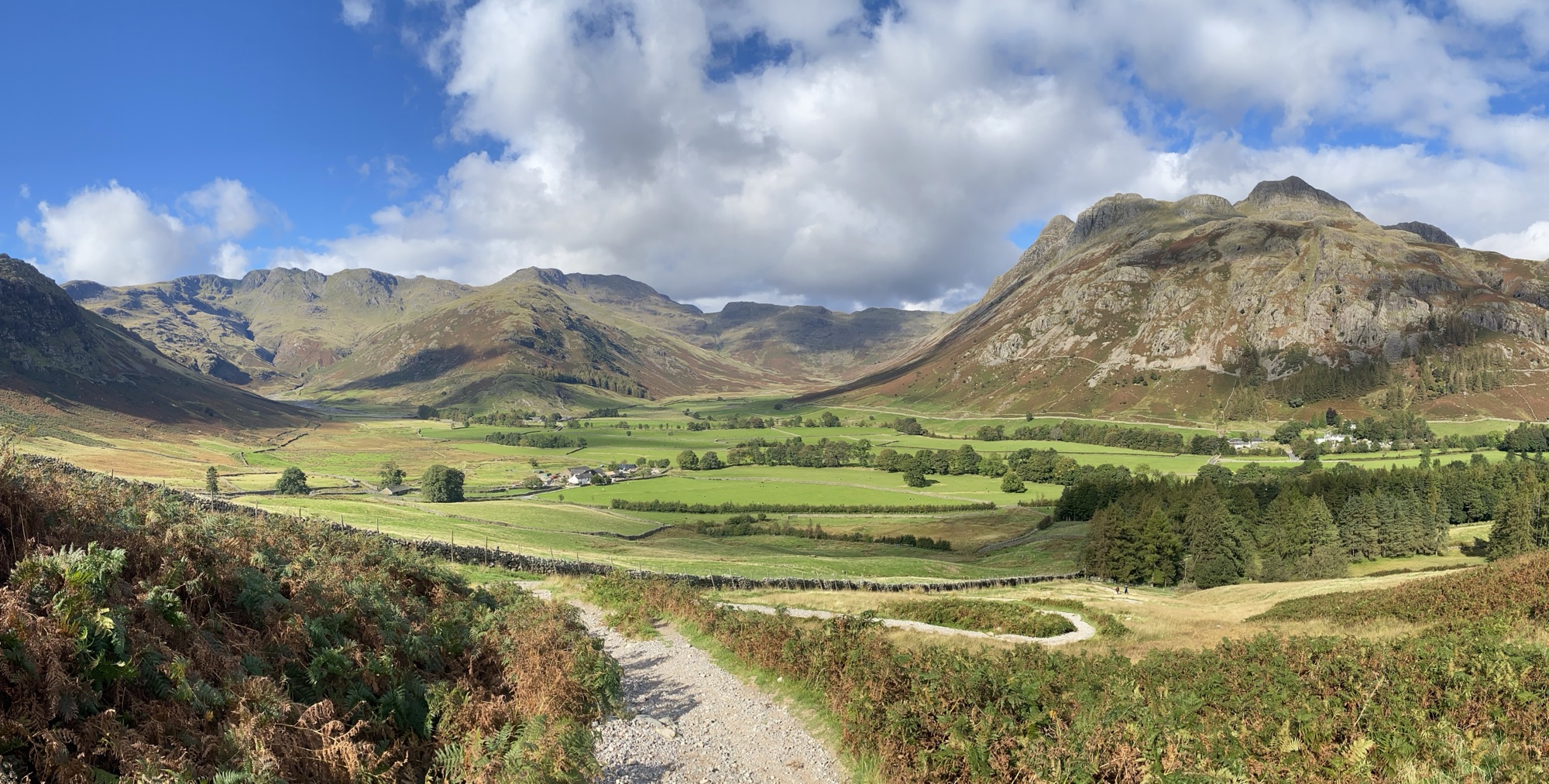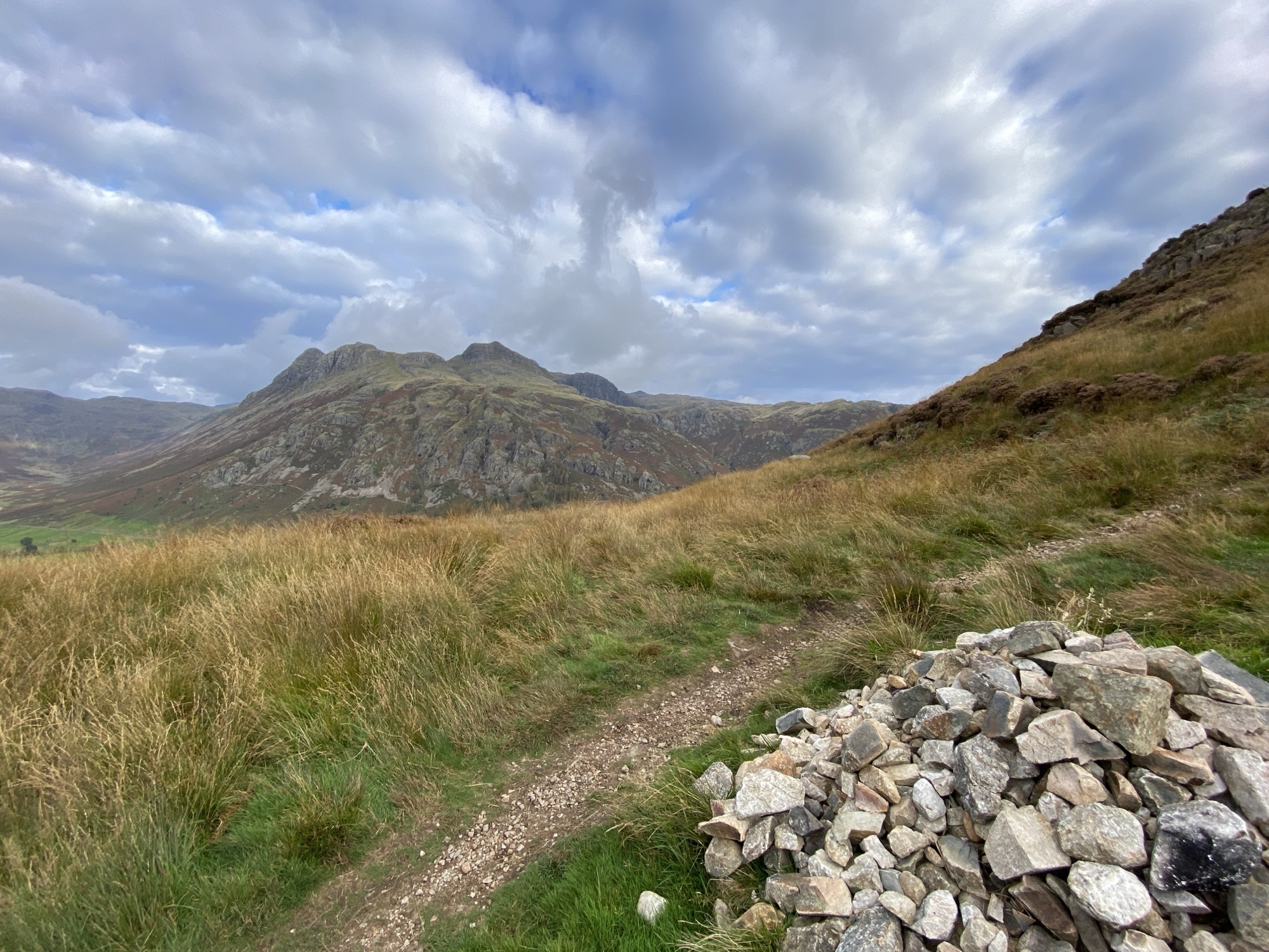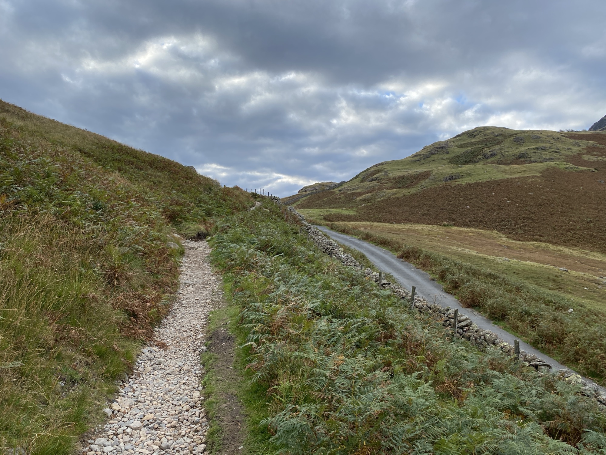 Once on the road it’s a slow and steady uphill back to the head of the pass, marked by a cattle grid on the OS map. The weather has been a bit up and down but the sun has come out again and I’m treated to a glorious view of the hills of Great Langdale sandwiched between the green grass and the blue cotton wool clouded sky.