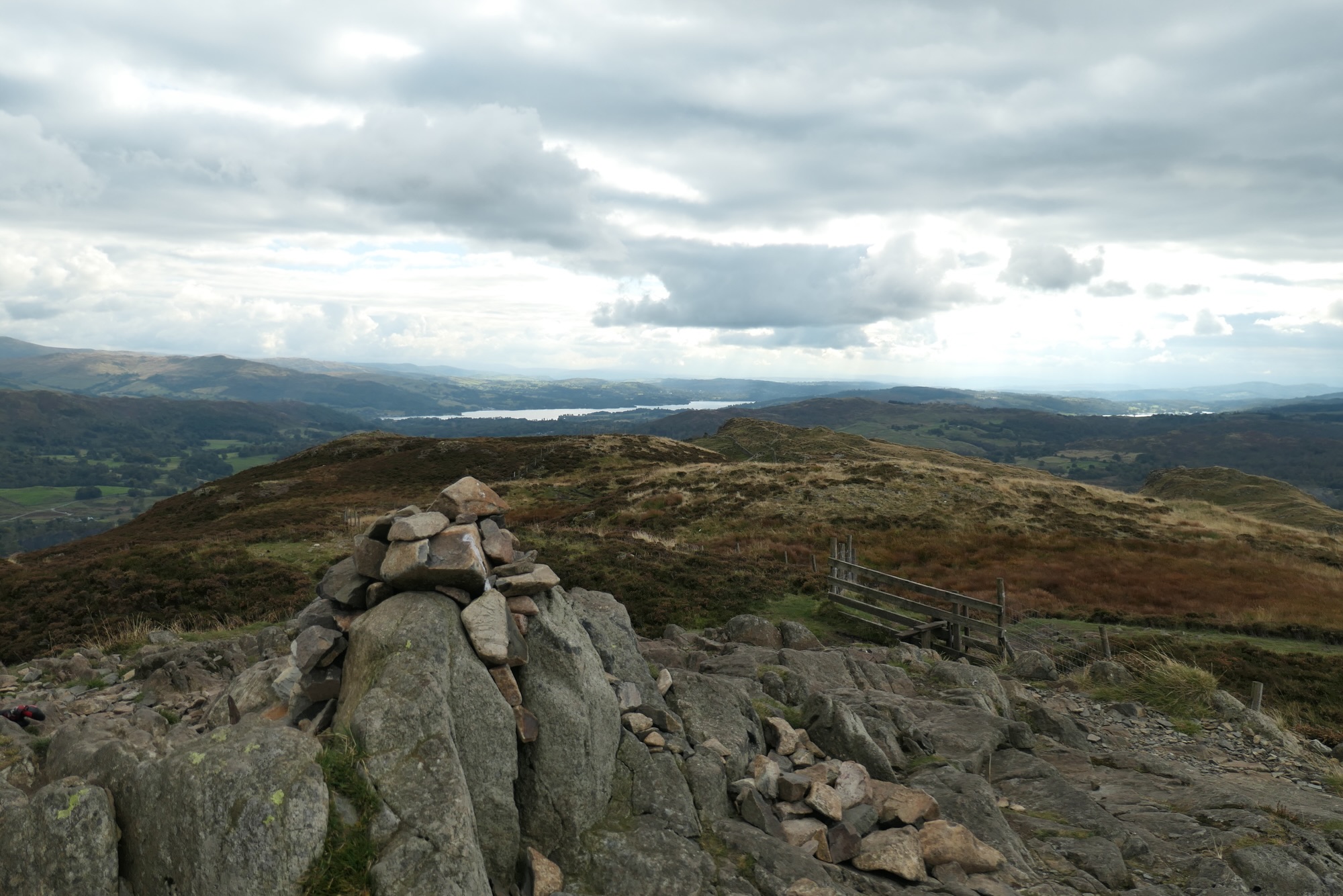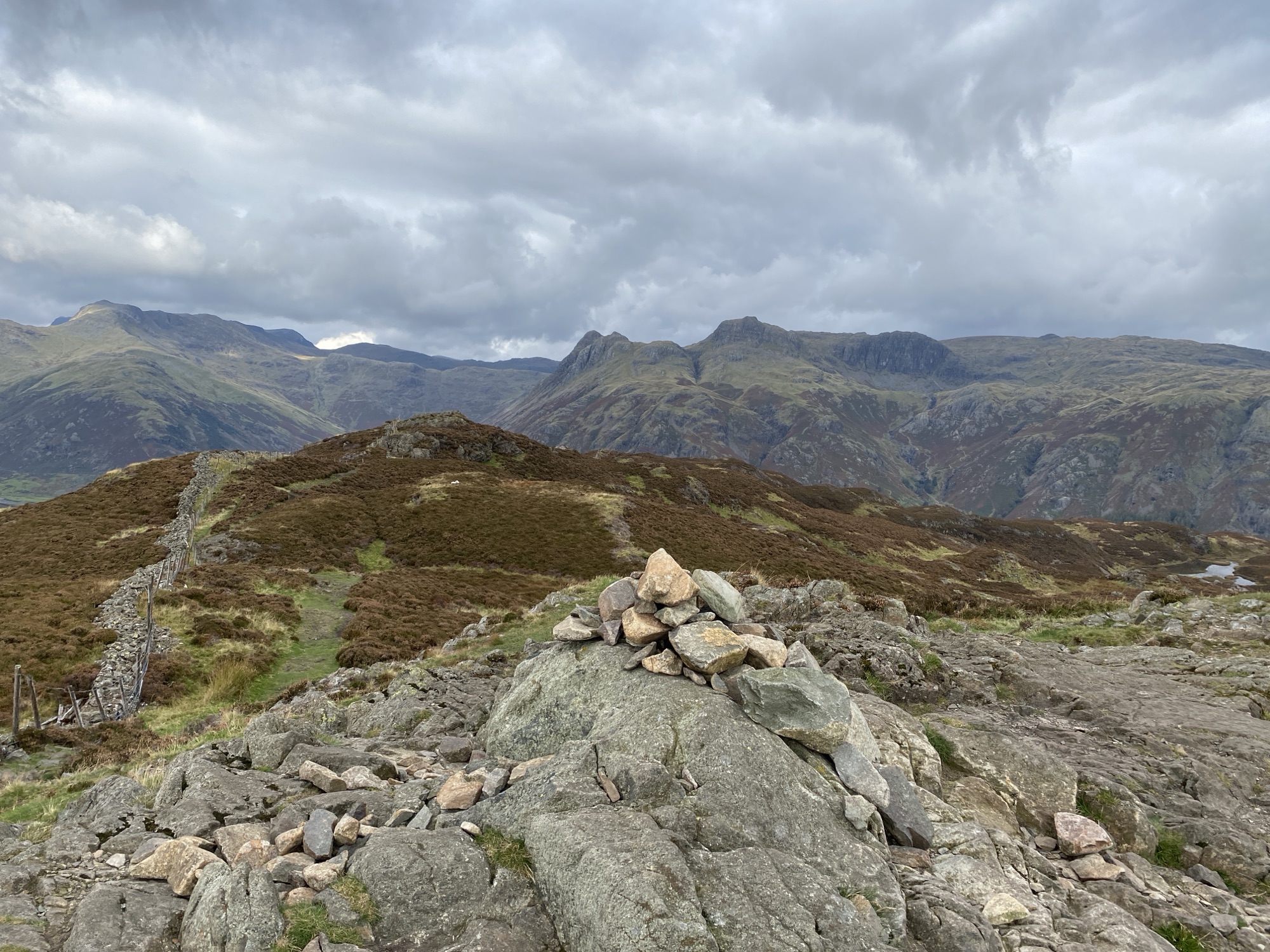 It’s a steep and occasionally rocky path but as promised by AW the views opening up across the valley to the Langdales and Bowfell are well worth the effort. A false summit leads to a small downhill and then a final climb takes me to the top.