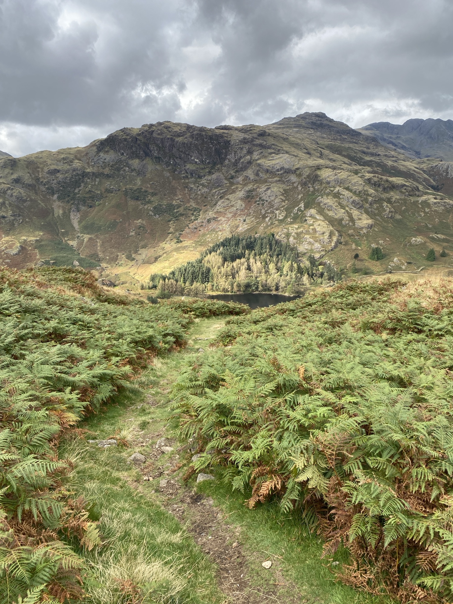 Dropping down from the summit I reach a little hollow which has a copse of Larch trees mentioned by Wainwright as a good viewpoint for the Langdales.