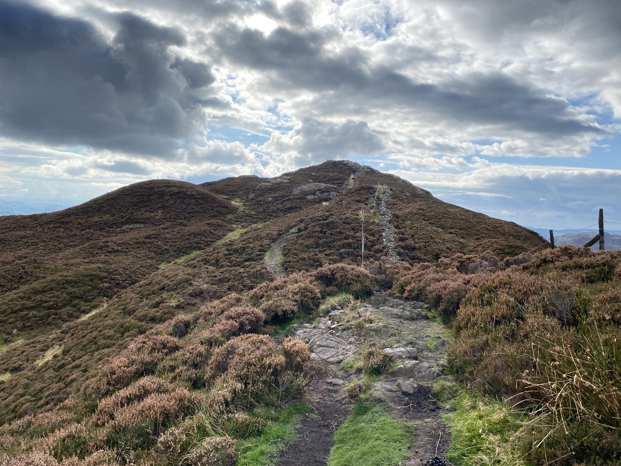 This doesn’t last long however and at the top of the last outcrop the summit can be seen about five hundred metres away, the trail bumping its way along the ridge through the heather.