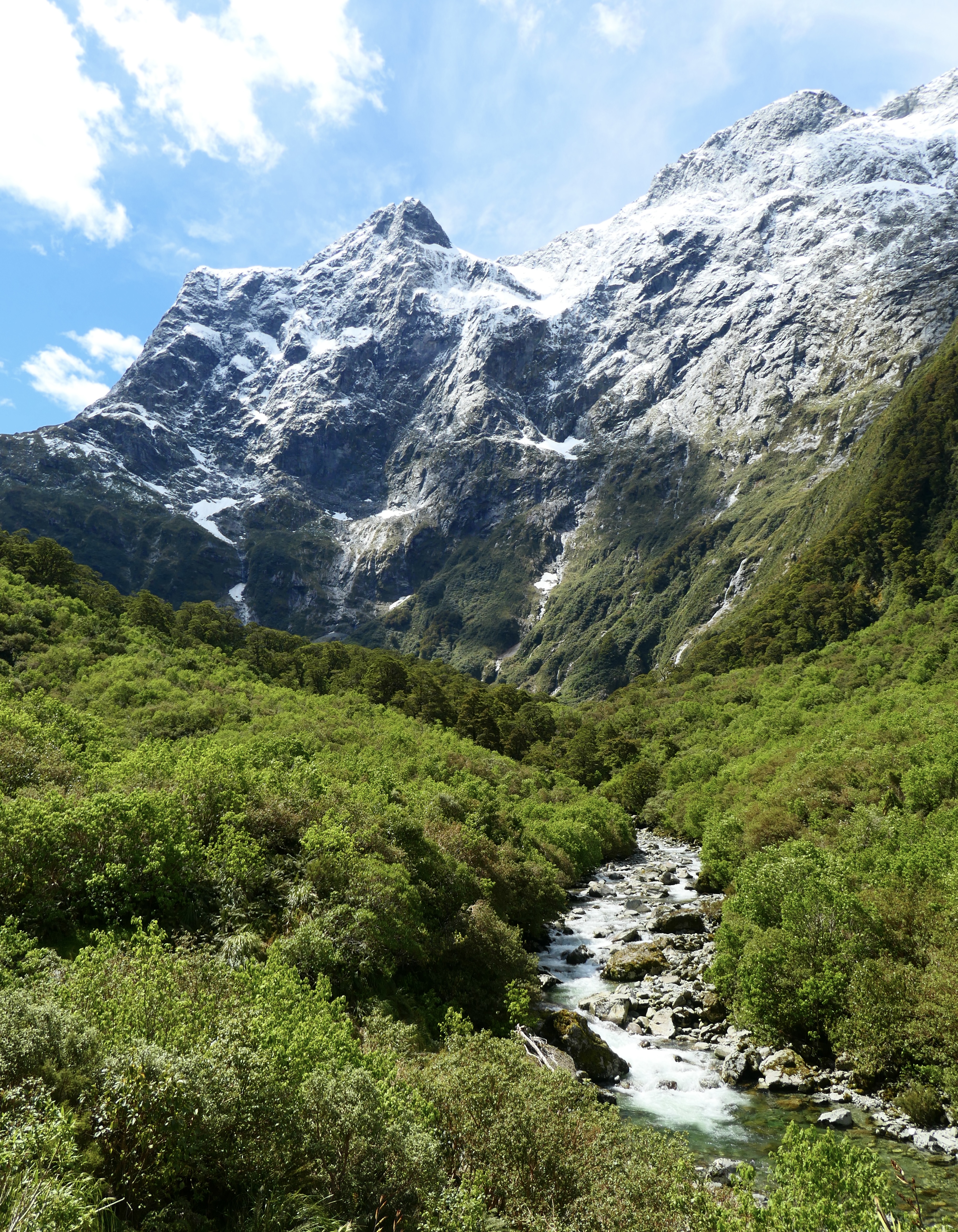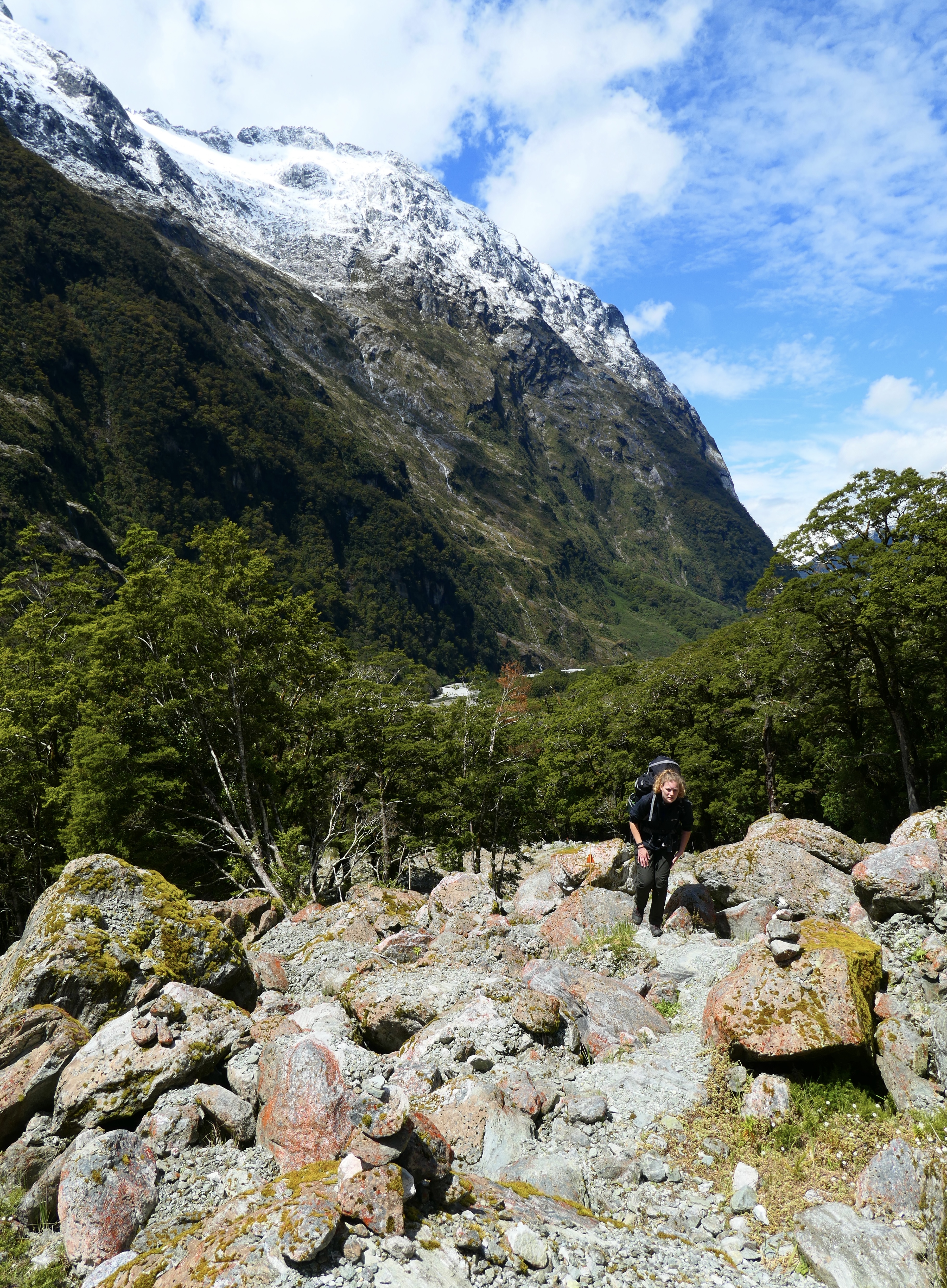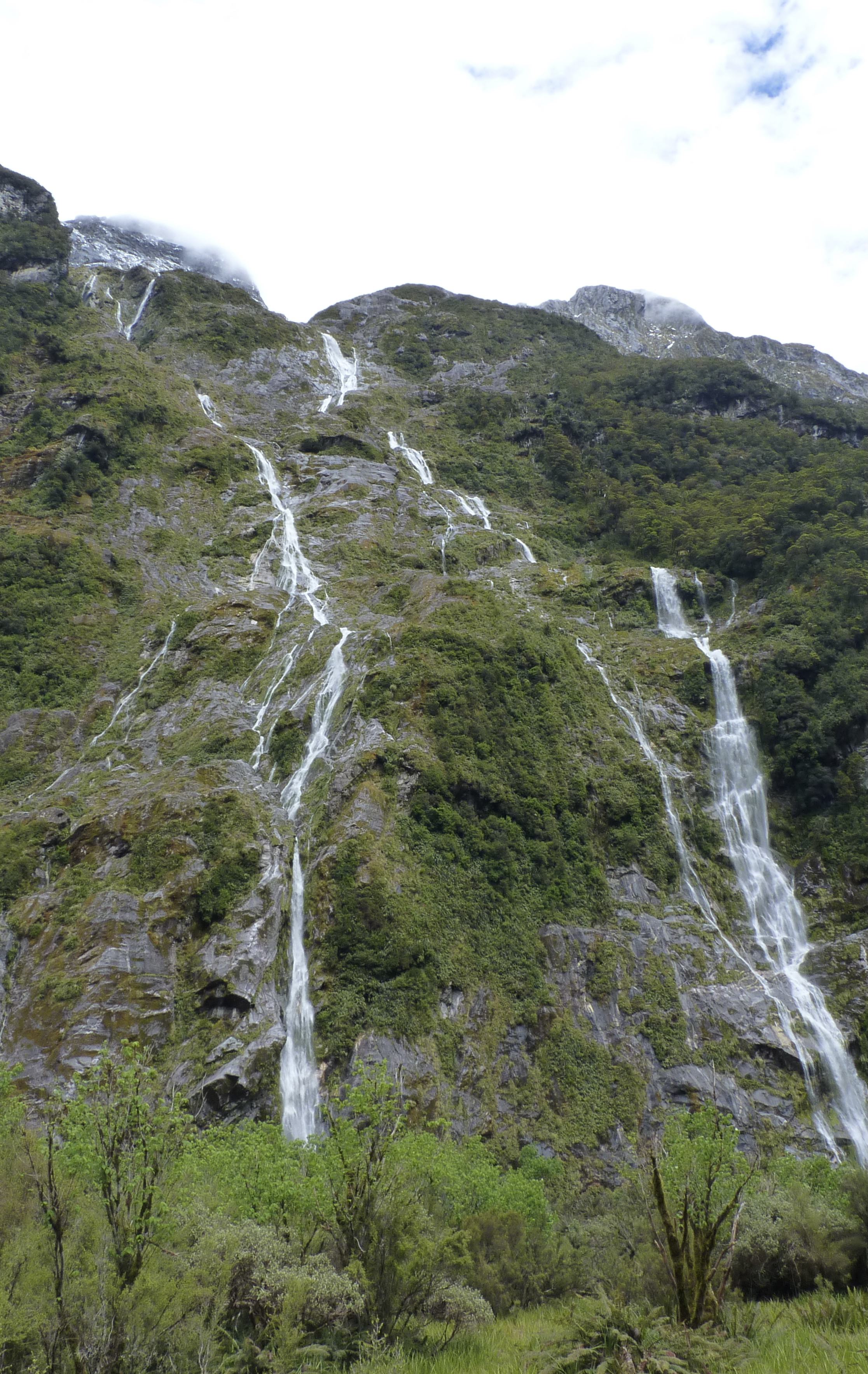 The further we walk into the valley, the narrower and steeper it’s sides become until eventually the Clinton valley morphs into the Clinton Canyon. Its here that the scenery is at its most dramatic. As the canyon narrows, there is an awareness that the valley sides seem to be closing in one you. On both sides of us now the sheer walls of the valley rise up almost vertically thousands of feet to their snow topped summits and ridges and great sheets of water are tumbling down them in torrents. The waterfalls are much closer now and the noise of water crashing down rock sounds like the rumble of a jet engine preparing for take off and is almost as loud.