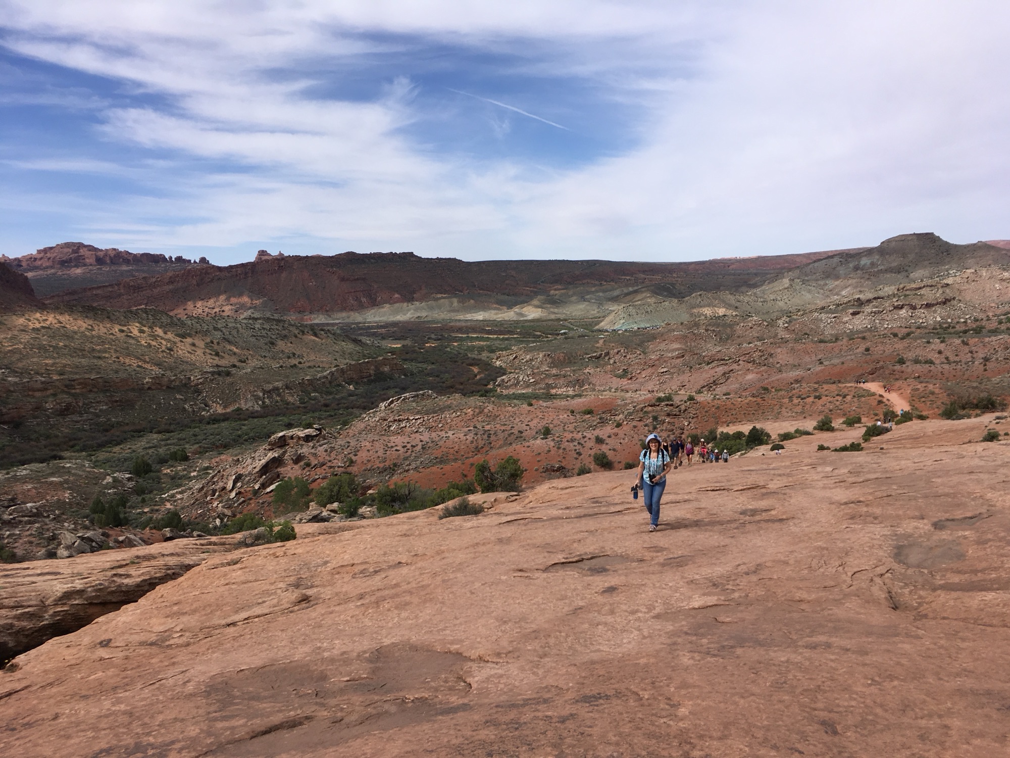 From the ranch the trail winds its way through desert brush along a well defined path until it reaches some large sandstone outcrops. As we make our way up and over the smooth flat sandstone bluffs the sun starts to beat down and I appreciate how harsh this landscape is, it’s a hot dry desert with no shade and no water. Fortunately we are only walking three miles and it feels like today the whole population of Utah has joined us for free National Park day.